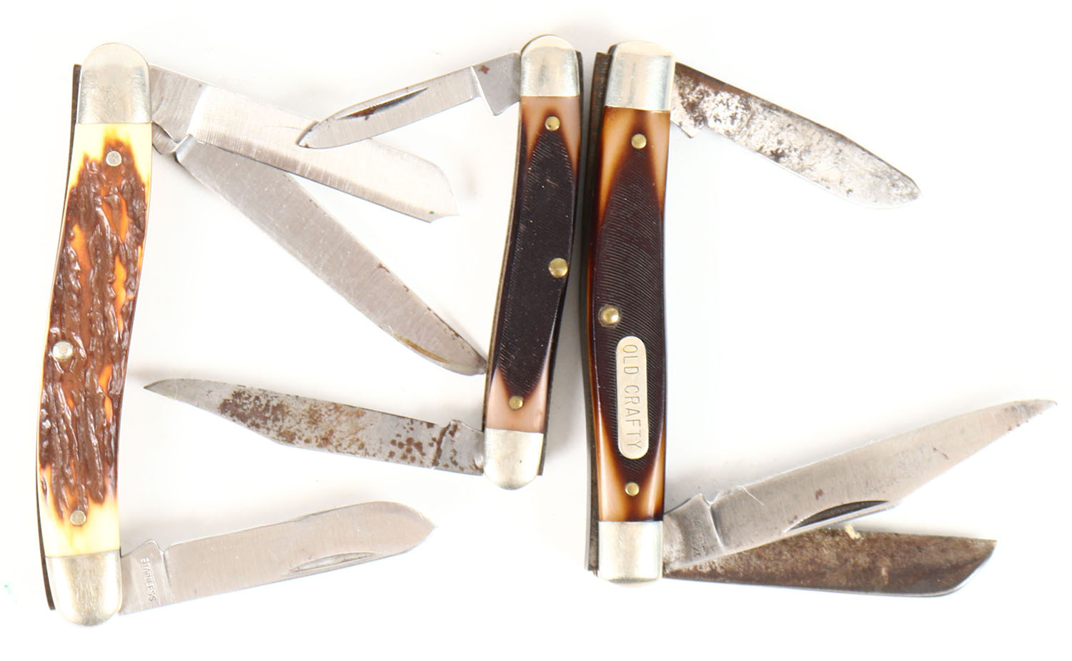 Lot of 3 folding knives, has age soiling. Grade: Very Good ++ - Value: 10 to 50