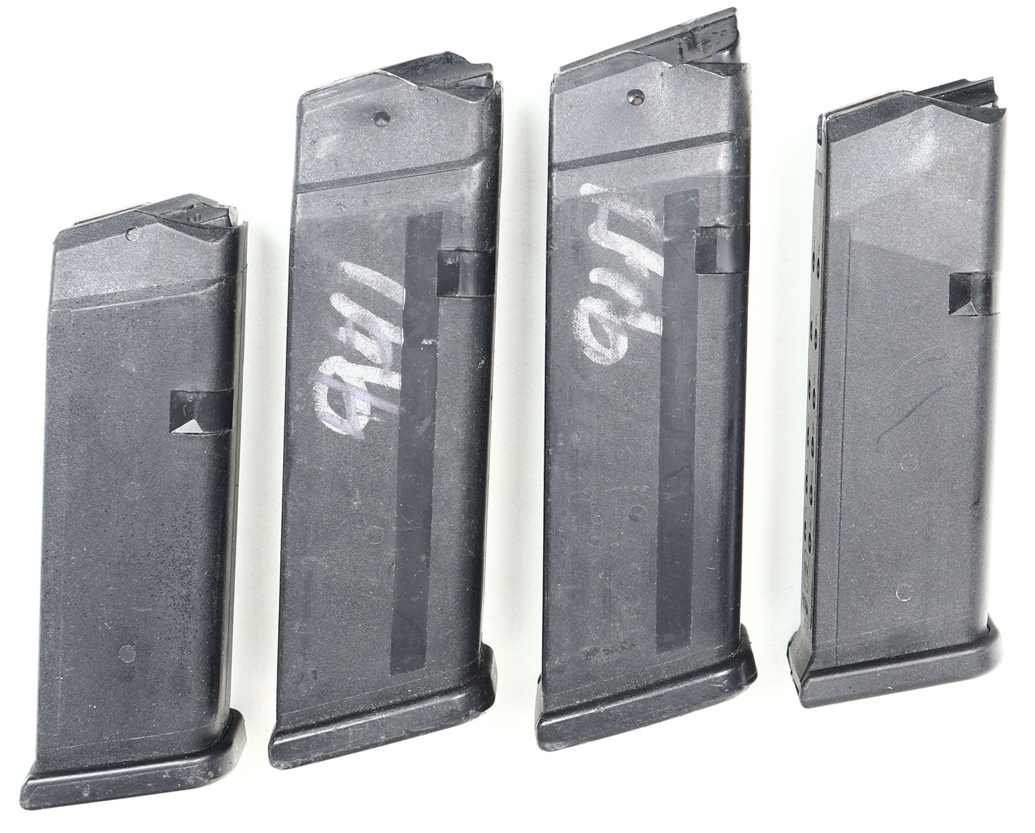 Lot of 4 Glock pistol mags, .40, 9mm and 45 cal mags. Grade: Excellent - Value: 16 to 60