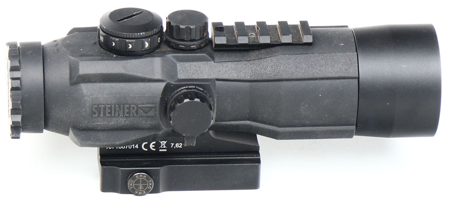 Steiner M536 5x36 rifle scope, clear view, need new battery, 5x Magnification for targeting out to 700 meters, Illuminated Ballistic Reticle with 10 brightness settings for day/night operation, Quick Detach Mount. Grade: Excellent ++ - Value: 200 to 400
