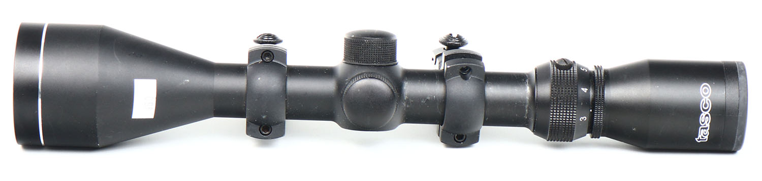 Tasco 3x-9x 50mm rifle scope, clear view with fine hair reticle. Grade: Excellent - Value: 40 to 100