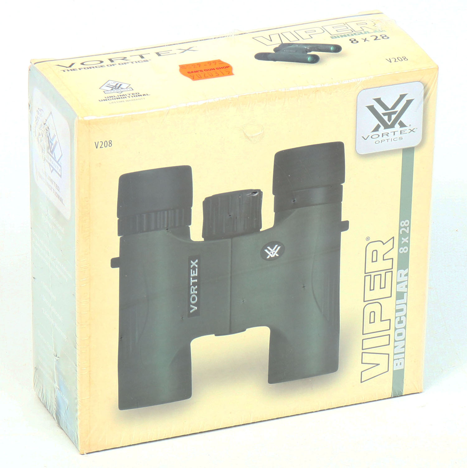 Vortex, Viper, 8x28 Binocular, NIB, comes with carrying case, neck strap, rain guard eyepiece cover, tethered lens covers, and lens cleaning cloth. Grade: MINT - Value: 50 to 200