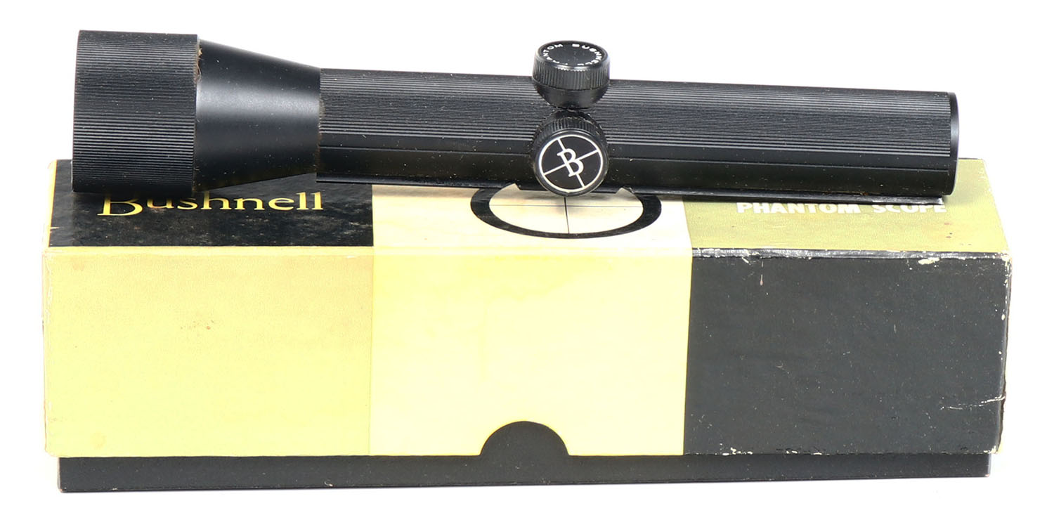 Bushnell Phantom scope in orignal box, handgun scope, 1.3x, all solid. Grade: excellent - Value: 20 to 60