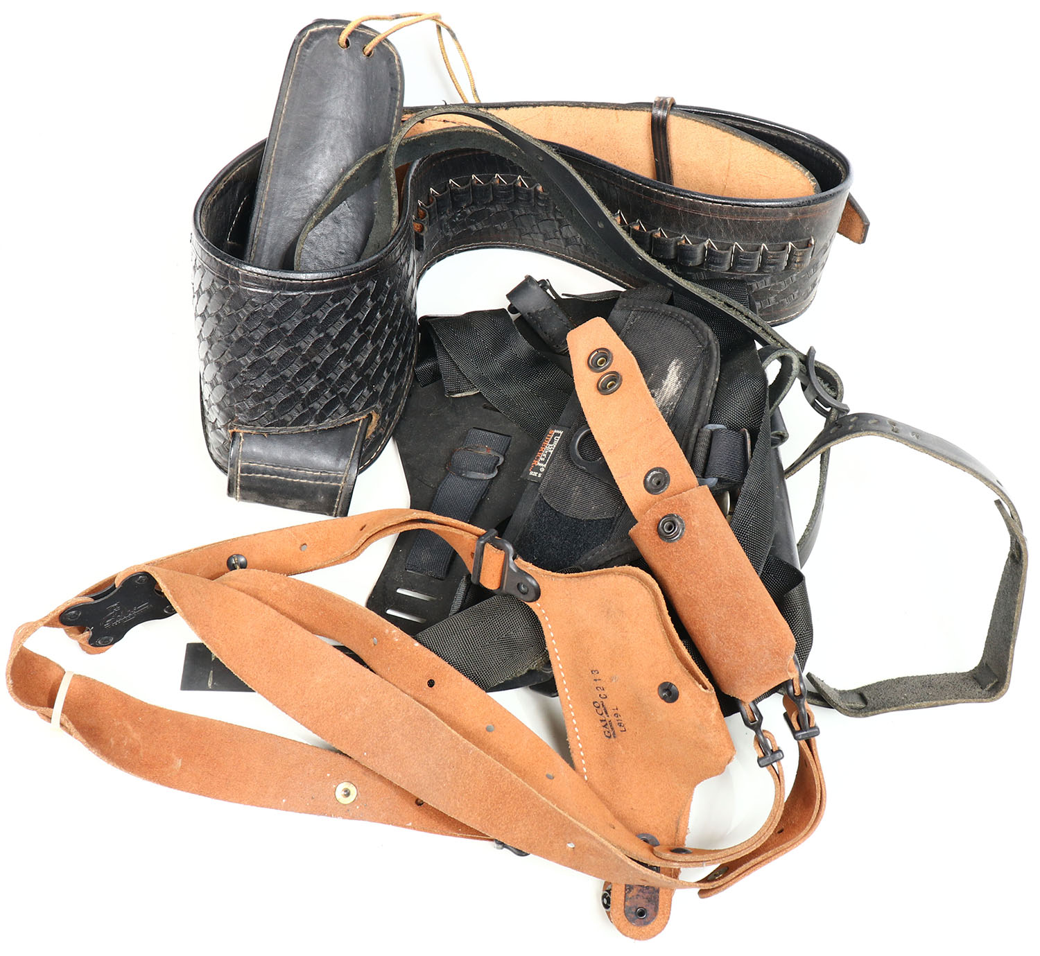 Large lot of leather and nylon belts and pistol holsters. Grade: Excellent - Value: 10 to 100