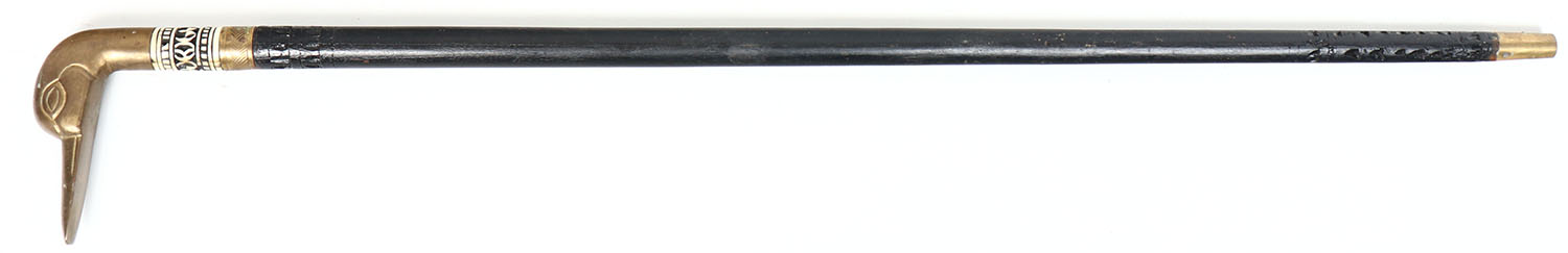 Wood cane with brass handle in the shape of duck head, 35'' oal. Grade: Excellent - Value: 4 to 40