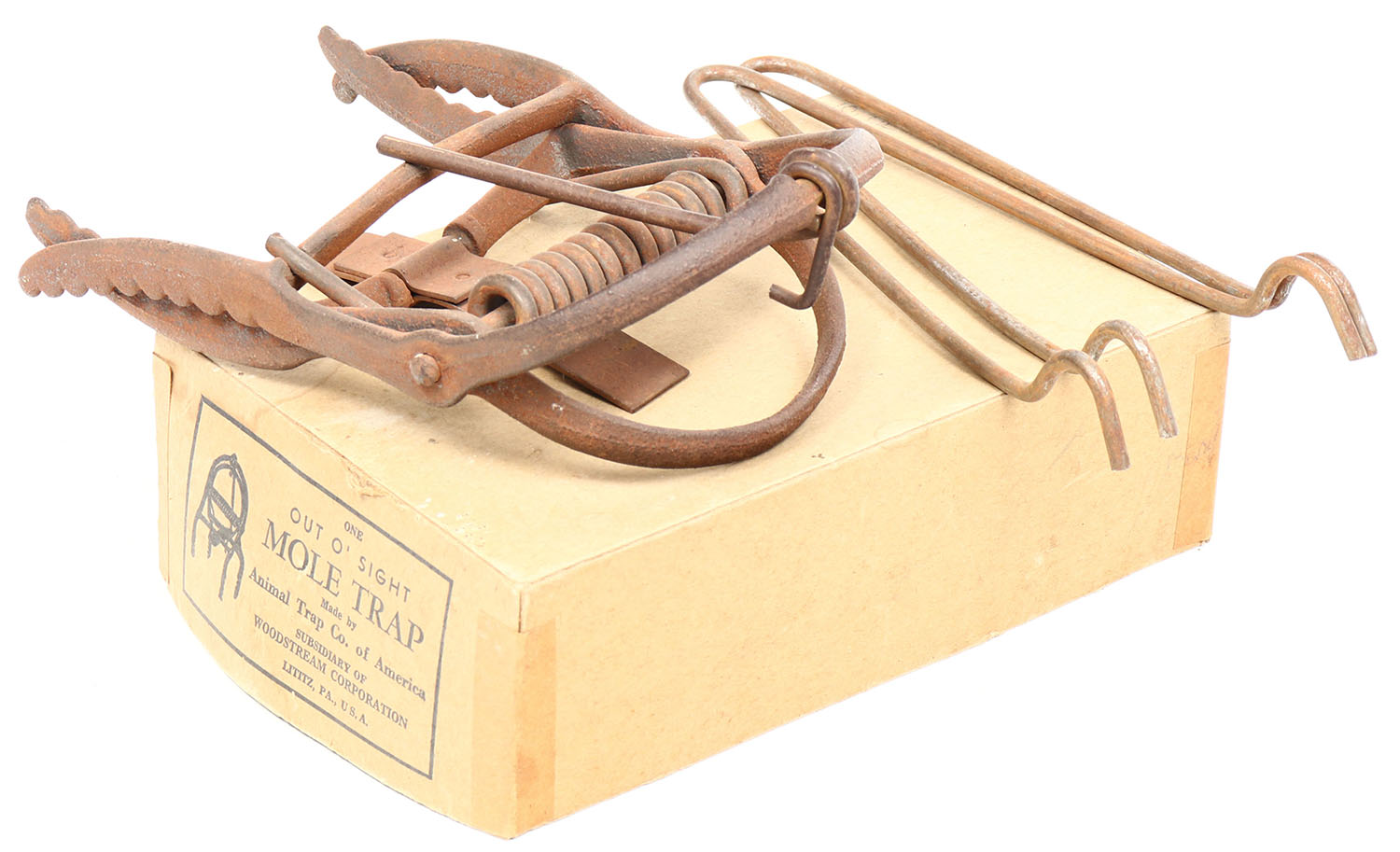 Out O Sight Mole Trap, in orignal box, has rust, has instructions. Grade: Excellent - Value: 10 to 50
