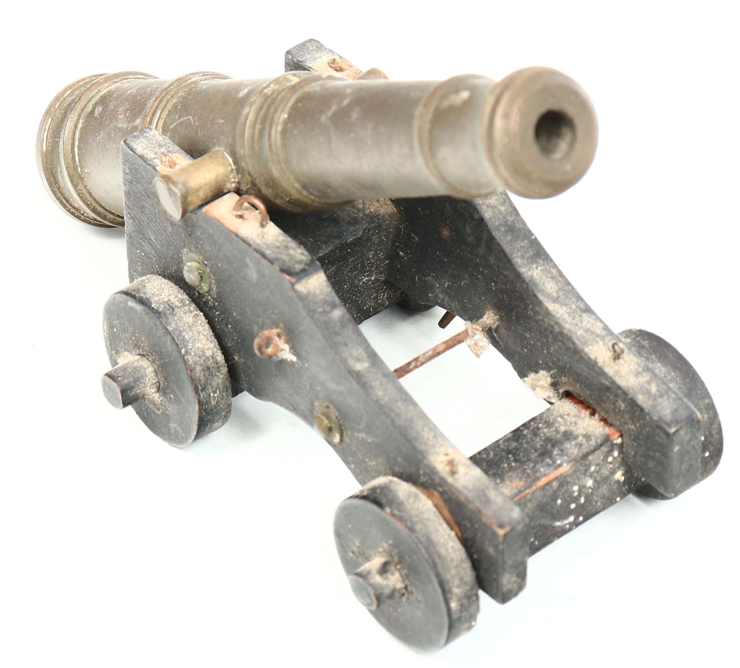 Small Solid brass cannon with wood wheels. Grade: Excellent - Value: 4 to 40