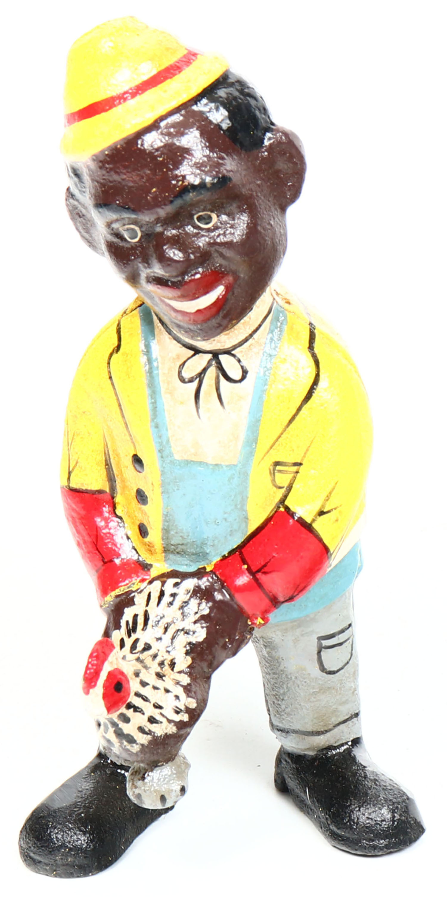 Cast Iron Black Sambo coin bank with chicken, 5 1/2'' tall, circa 1930. Grade: Excellent - Value: 50 to 200