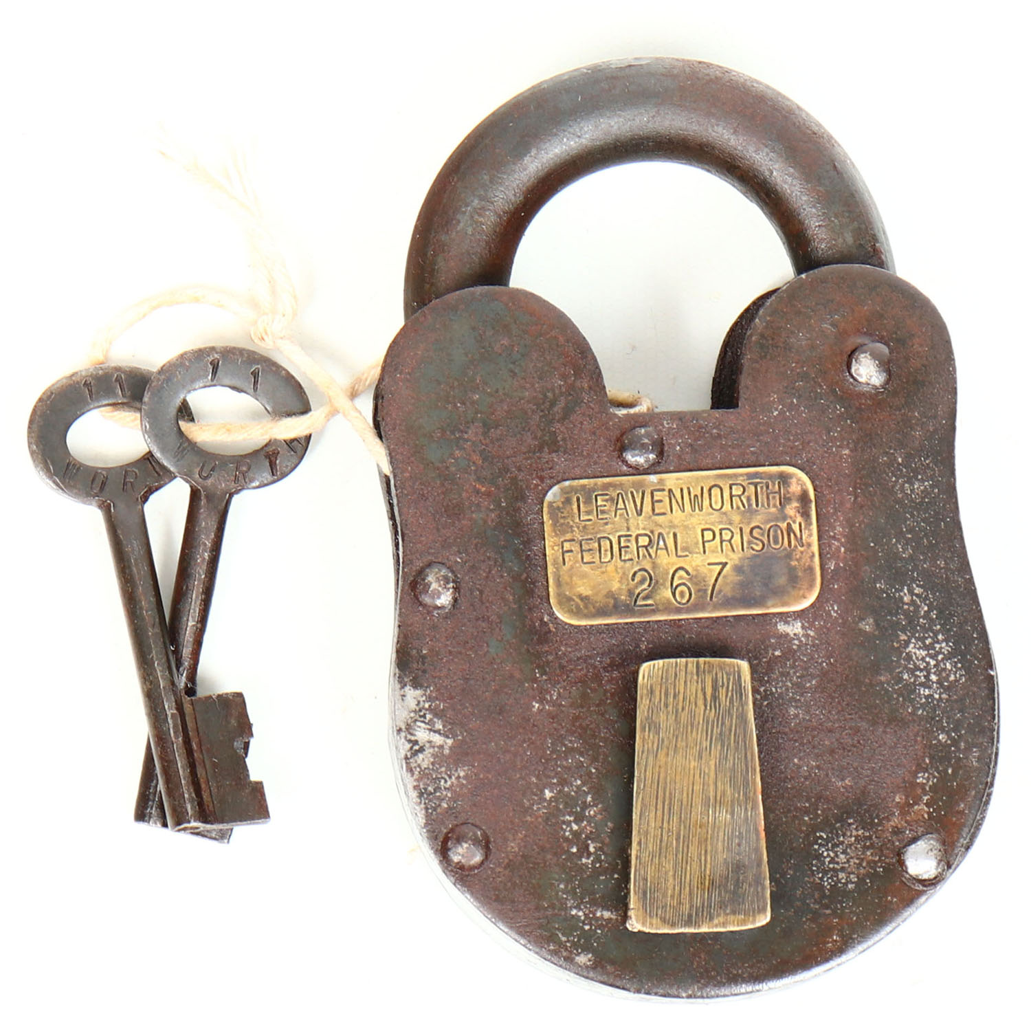RARE! Old and large Leavenworth Federal prison #267 steel padlock with both keys, brass hardware. Grade: Very Good - Value: 100 to 600
