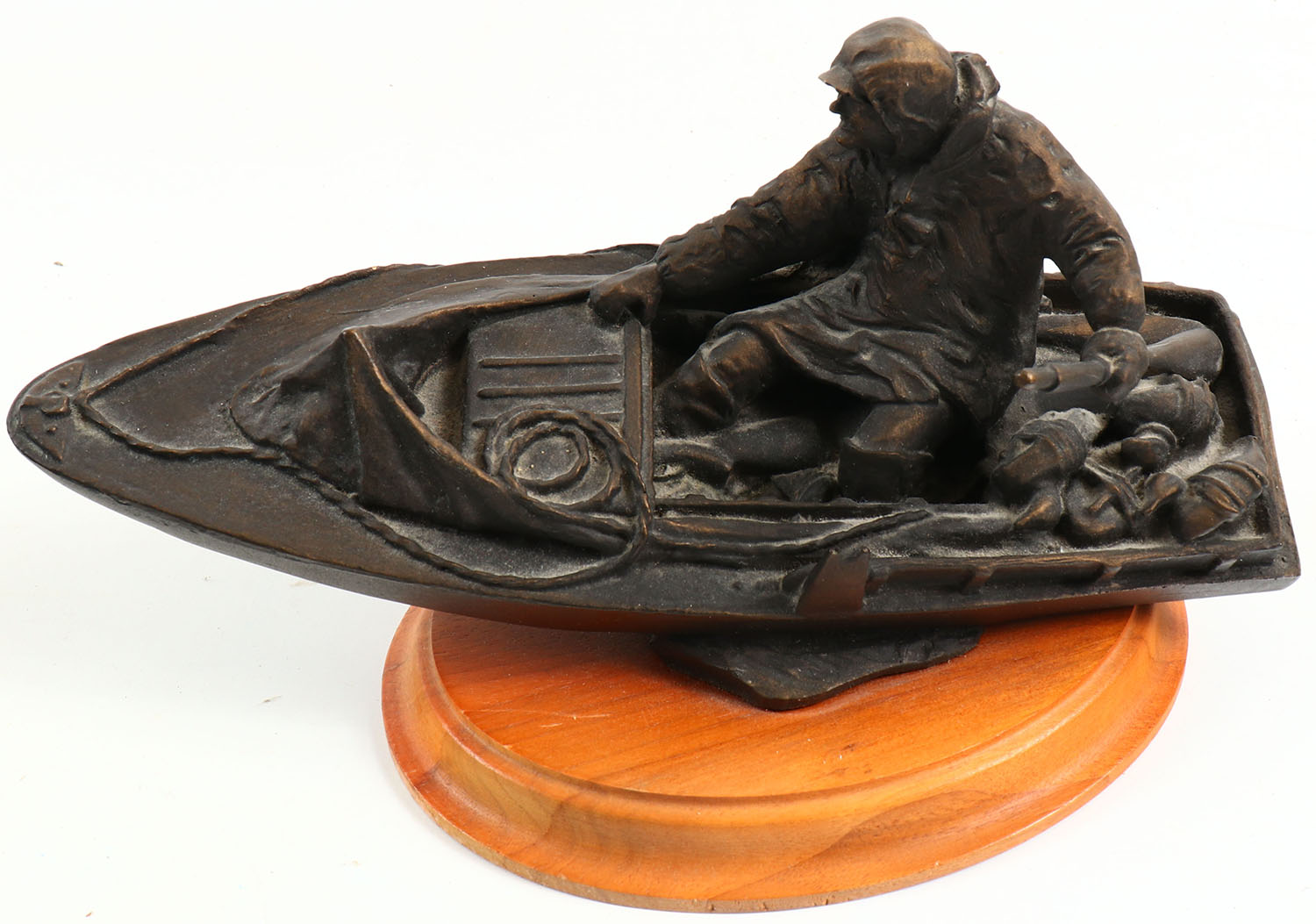 Sculpture of a man in a boat going duck hunting, Fornelli marked on back, 10 '' OAL. Grade: Excellent - Value: 16 to 60