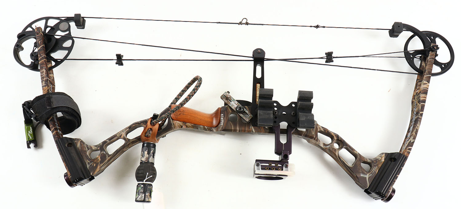 Buckmaster Mission compound bow, very nice high-end bow! 35'' OAL, camo paint #878798. Grade: Excellent ++ - Value: 100 to 400
