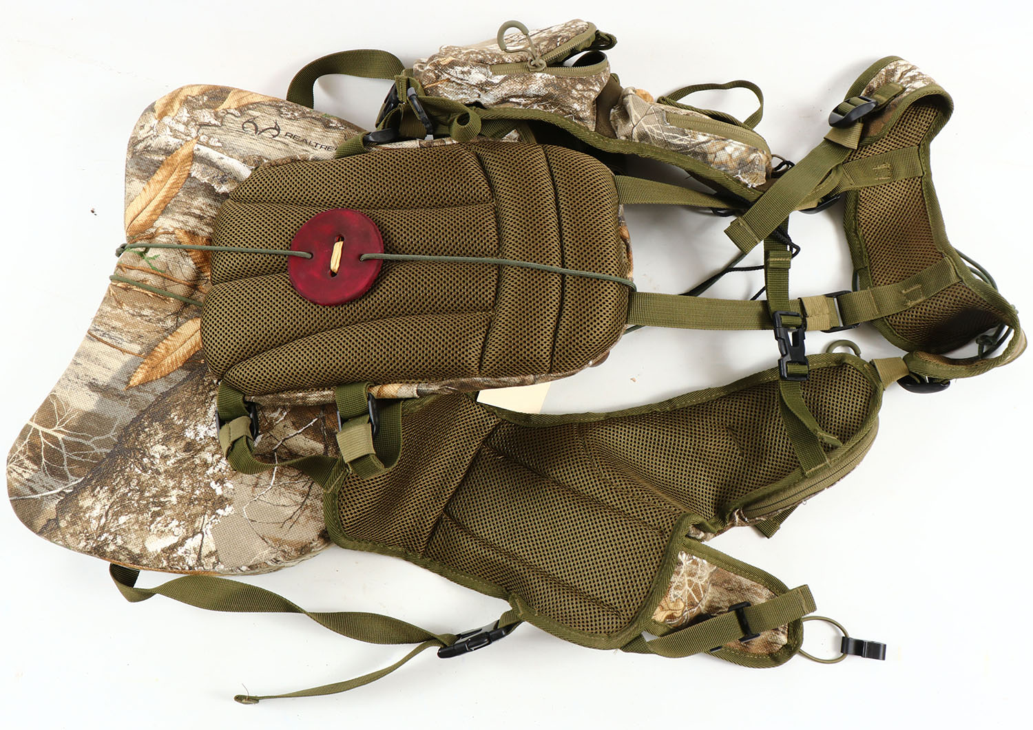Realtree camo hunting vest with cushion seat to sit on, many pockets, K-H 1972. Grade: Excellent - Value: 16 to 60