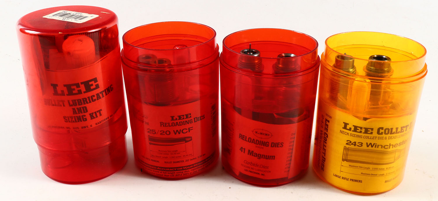 Lot of 4 LEE reloading dies, 25-20, 41 MAG, 457 & 243 WIN, in original box. Grade: Excellent - Value: 10 to 60