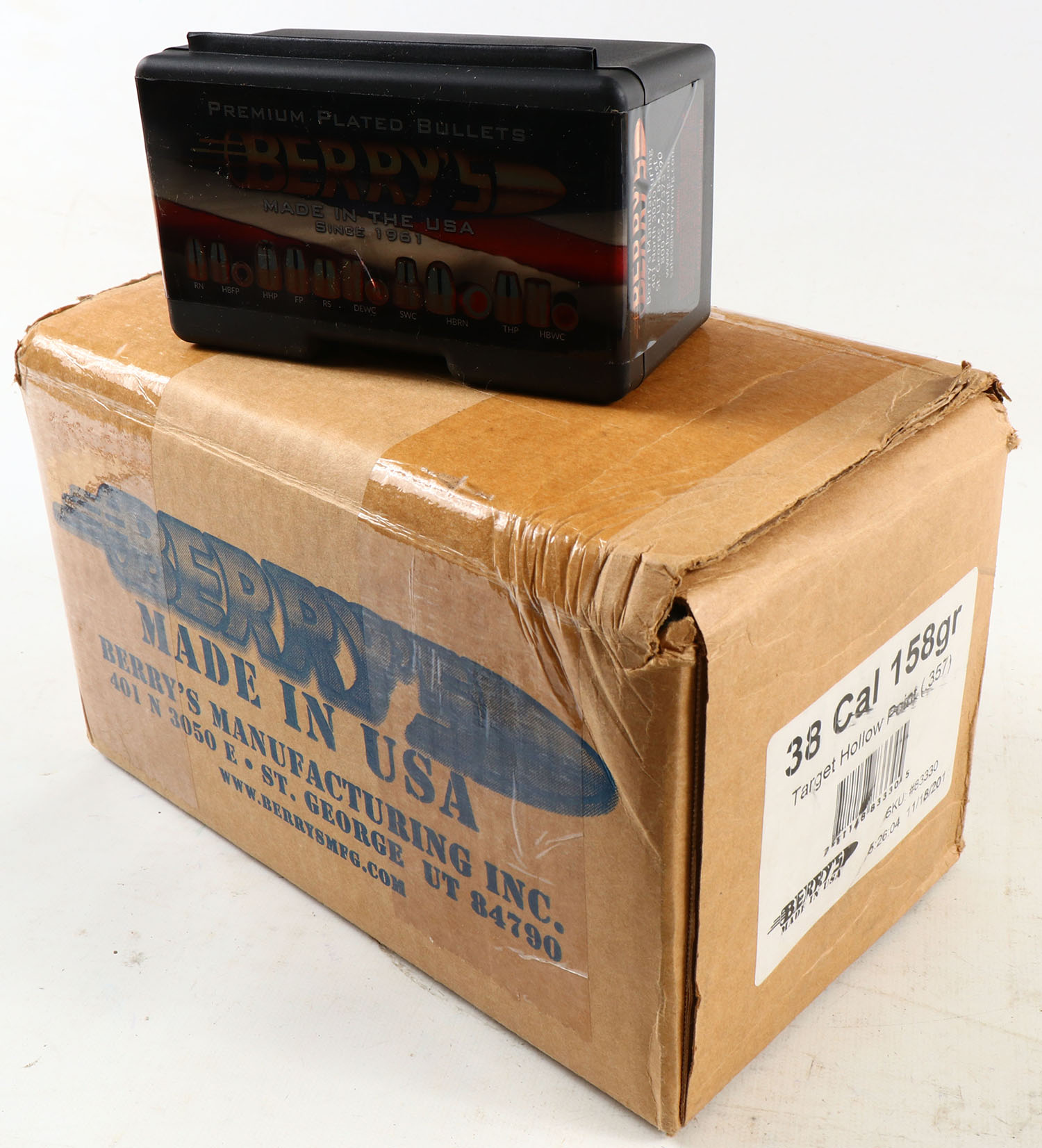 Full case of Berry's Hart Cast Bullets, 38 cal 158gr target hollow point, 1200 rds total. Grade: MINT - Value: 100 to 400