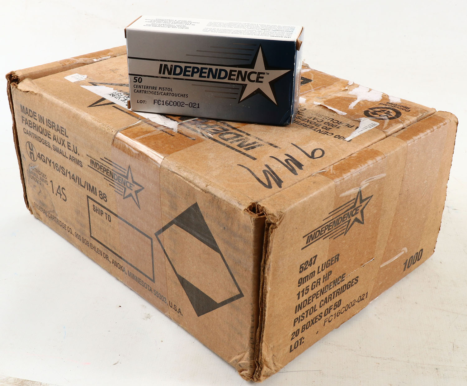 900 rds of Independence 9mm Luger, 115 gr HP loaded rounds in 50 count boxes. Grade: MINT - Value: 100 to 300