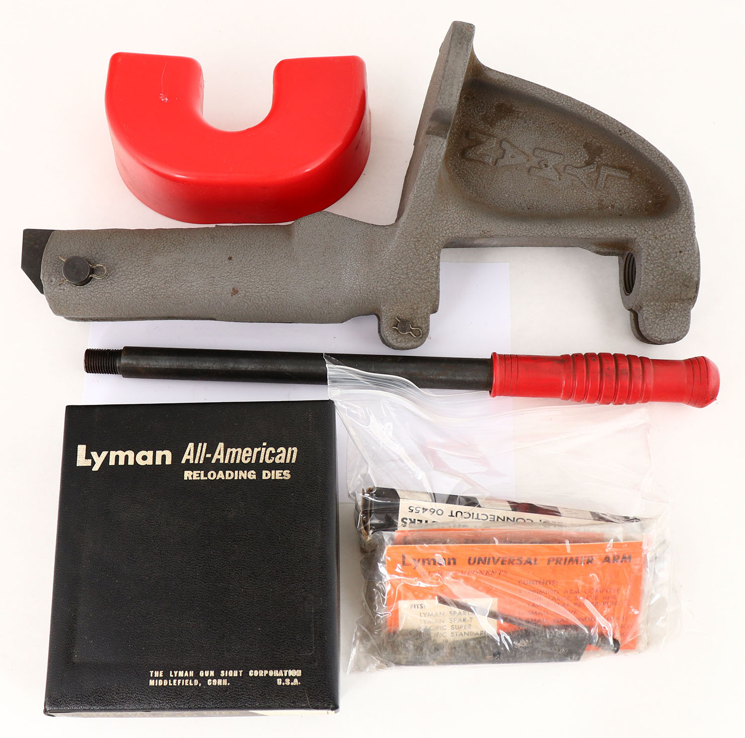 Lyman Sapr Reloading Press with Ram, Shell holder head and priming arm, 45 ACP in box. Grade: Excellent - Value: 10 to 60