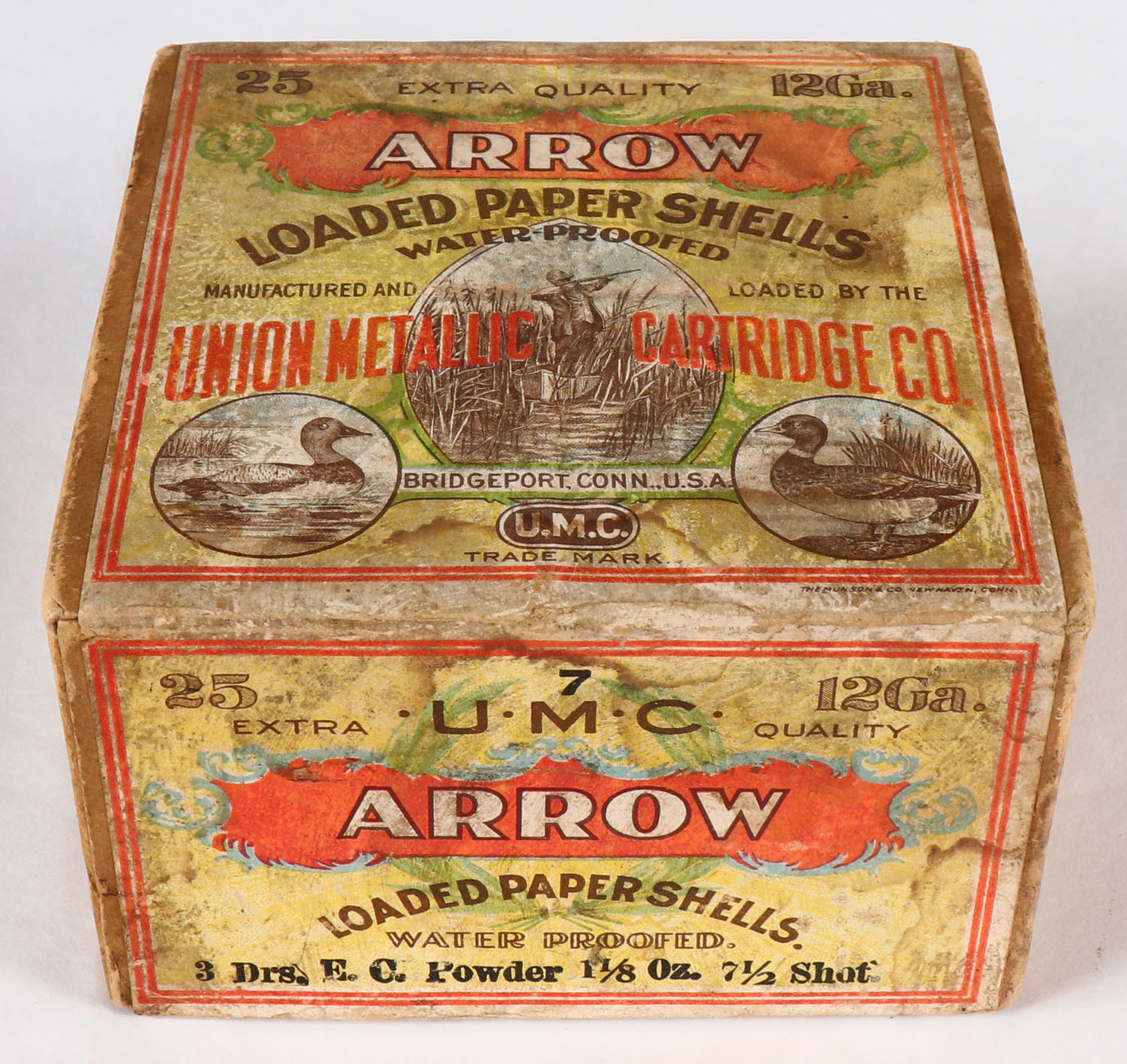 UMC, ARROW, WALKING MAN SERIES, 12ga., 2pc., FULL & SEALED, shot size 7 1/2, buff box with multi colored label pictures hunter shooting from boat in center, Canvasback in bottom left hand corner & a Mallard in the bottom right, box is all original and solid, box has age soiling with minor edge wear with wonderful colors, Hard To Find Box. Grade: Excellent - Value: 1000 to 4000