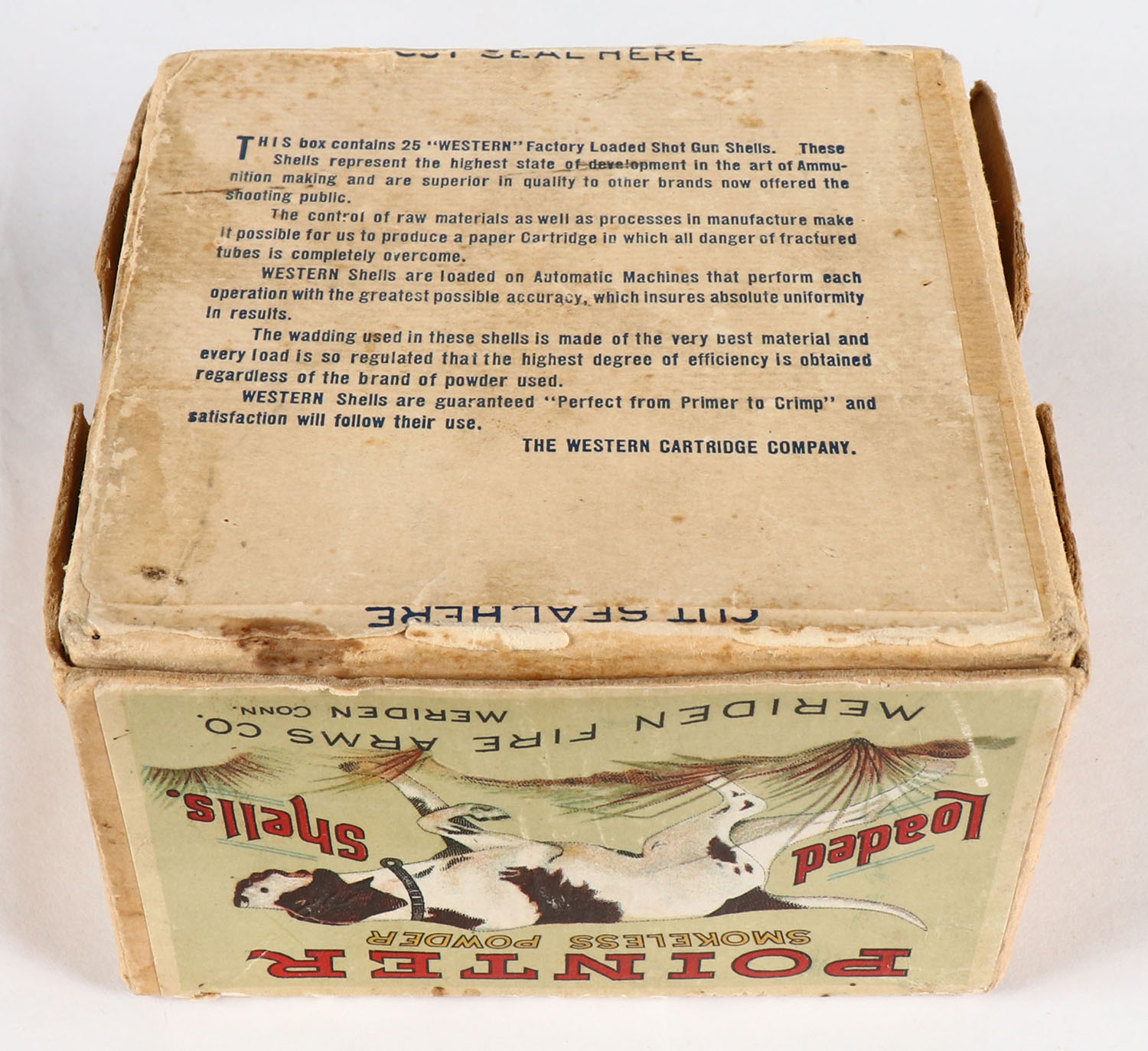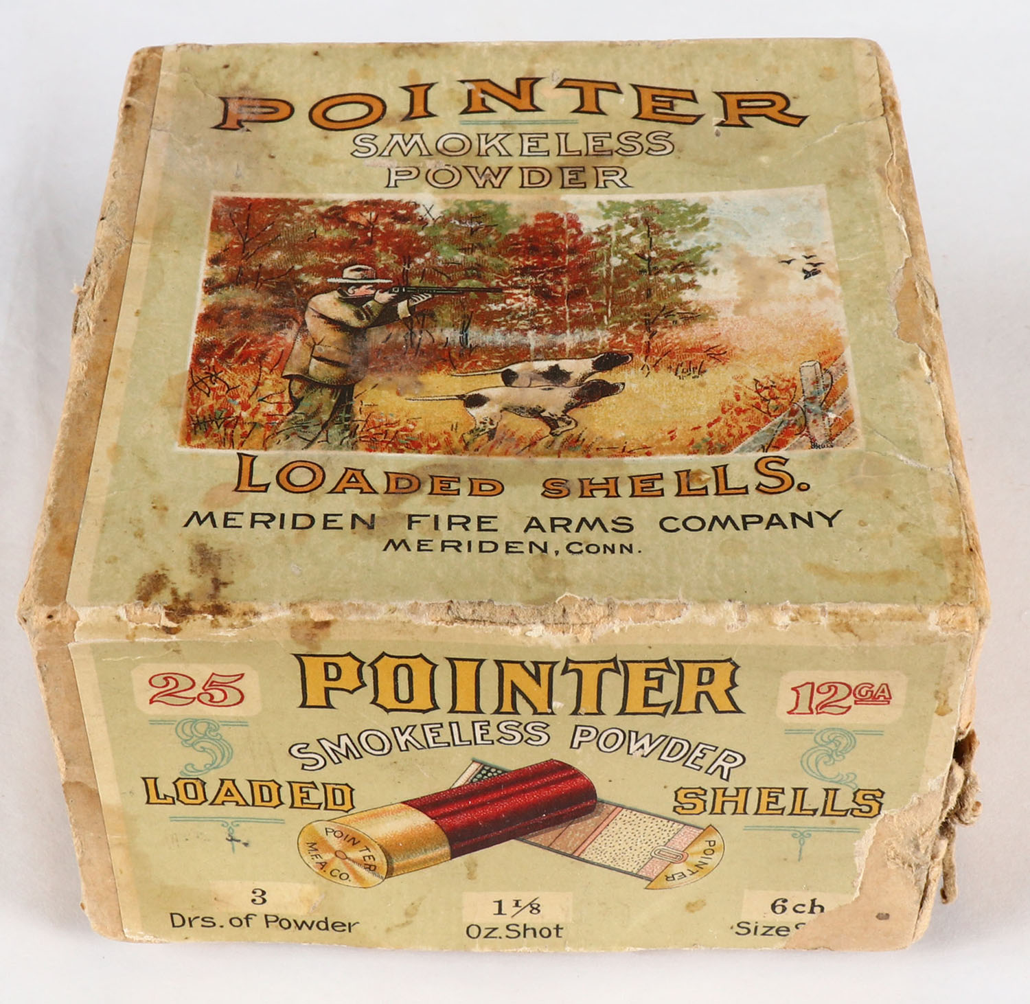 Meriden Firearms Co., POINTER, 12ga, 2pc., Empty, shot size 6 wrong bottom, buff box with multi colored label pictures hunting scene on top, two crossed shells on one side & pointing dog on the other side, box has light soiling, light edge wear & scuffing. Grade: Very Good + - Value: 50 to 250
