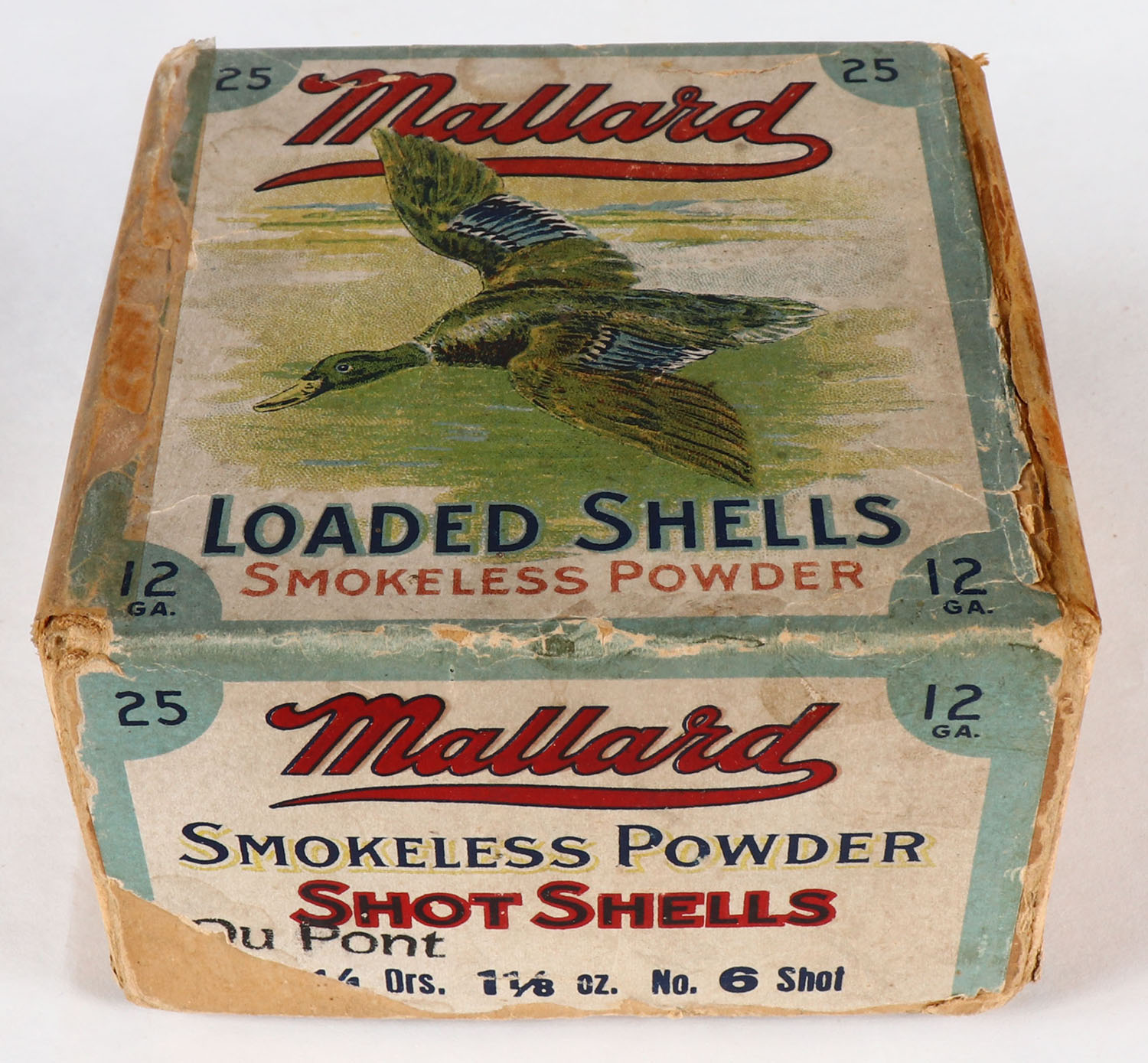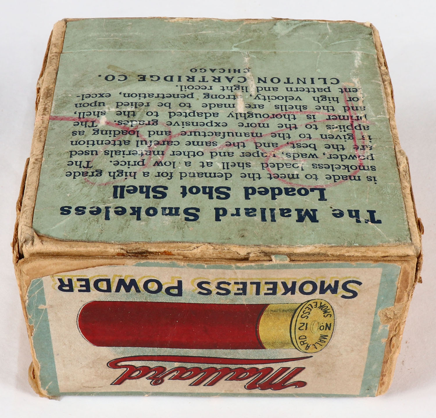 RARE! Clinton Cartridge Co., MALLARD, 12ga., 2pc., Empty, shot size 6, Loading 1 1/8 oz. No. 6 Shot, buff box with multi colored label picturing a Mallard flying down, box has very nice colors with light soiling & scuffing, has tape repairs with writing on bottom, label is 100% ORIGINAL, VERY RARE BOX! Grade: Good ++ - Value: 400 to 1000