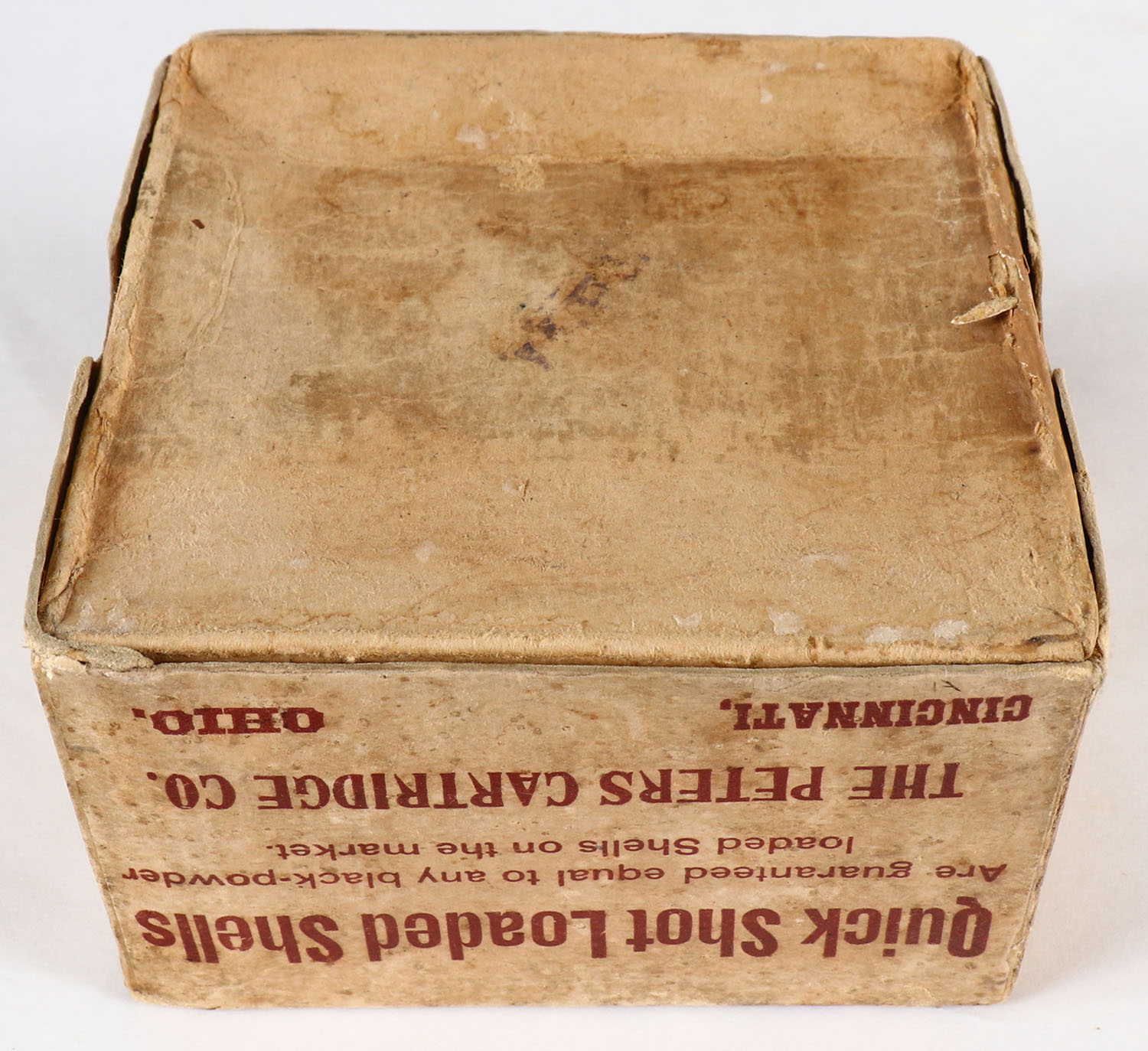 Peters, QUICK SHOT LOADED SHELLS, 12ga., 2pc., Empty, shot size 6, buff box with buff & red label, pictures large red shot shell on top, label is great, box has age soiling with light scuffing otherwise very solid, Very Rare & Hard to find box. Grade: Very Good ++ - Value: 1000 to 3000