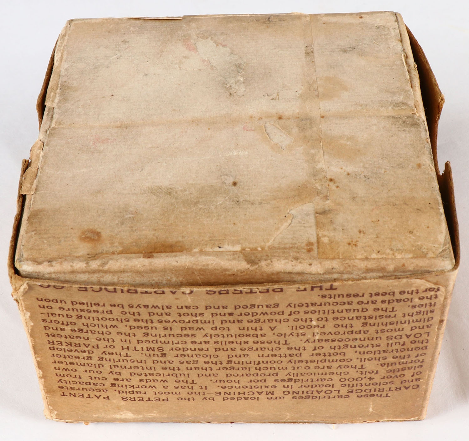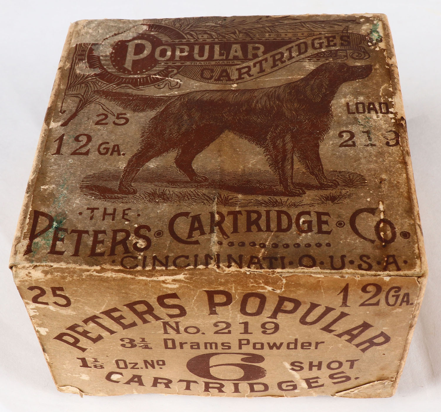 RARE Peters, Popular Cartridges, 12 ga., Empty, shot size 6, buff box with brown label, pictures dog on point, box has age soiling with scuffing, has some edge wear, Very Rare & Hard to find box. Grade: Very Good + - Value: 1000 to 3000