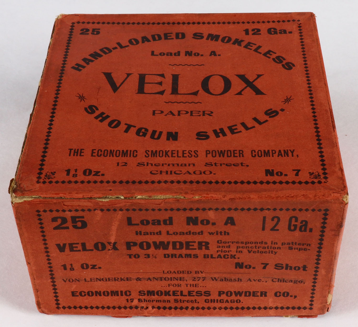 Von Lengerke & Antoine Hand Loaded Cartridges, 12ga., 2pc., Empty, shot size 7, Buff box with black & orange label, box is solid with a seam split, has excellent colors with minor edge wear. Grade: Excellent - Value: 200 to 1000