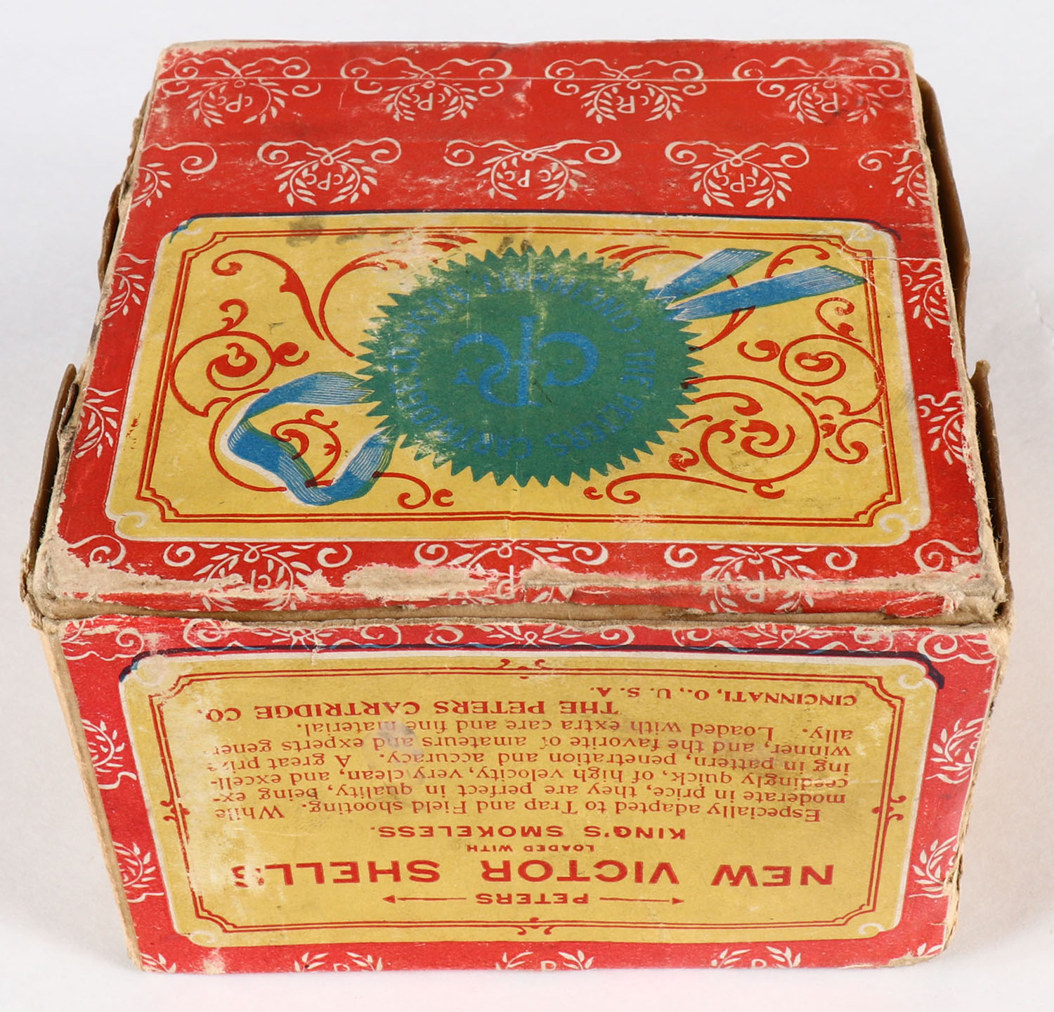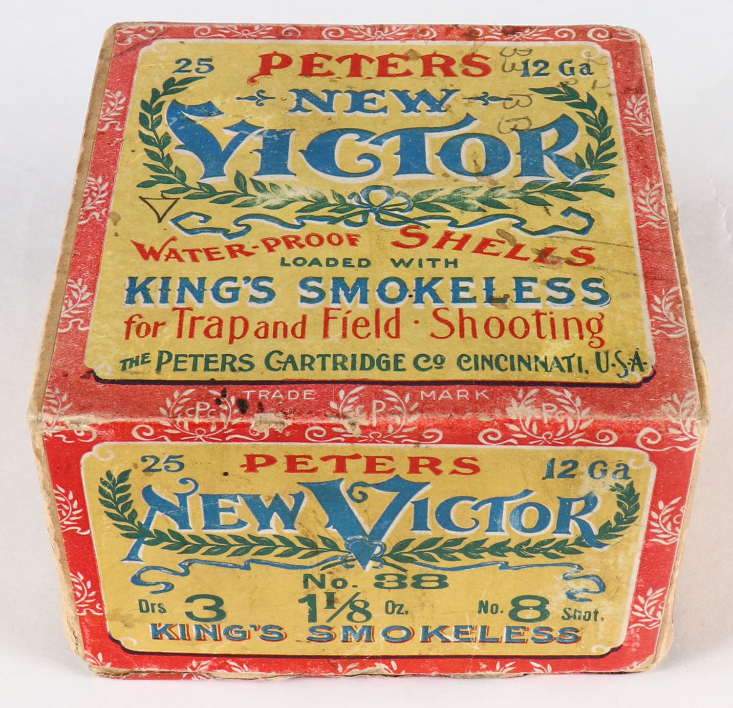 Peters Cart. Co., New Victor, 12ga., 2pc., Partial 16rds of fired paper, shot size 8, buff box with multi-colored label, Loading: No. 38, 3 Drs., 1 1/8 Oz. No. 8 Shot, King's Smokeless, box has great label with bottom label being correct & being 100% intact, box has age soiling with edge wear, paper shells are very good. Grade: Very Good ++ - Value: 1000 to 3000