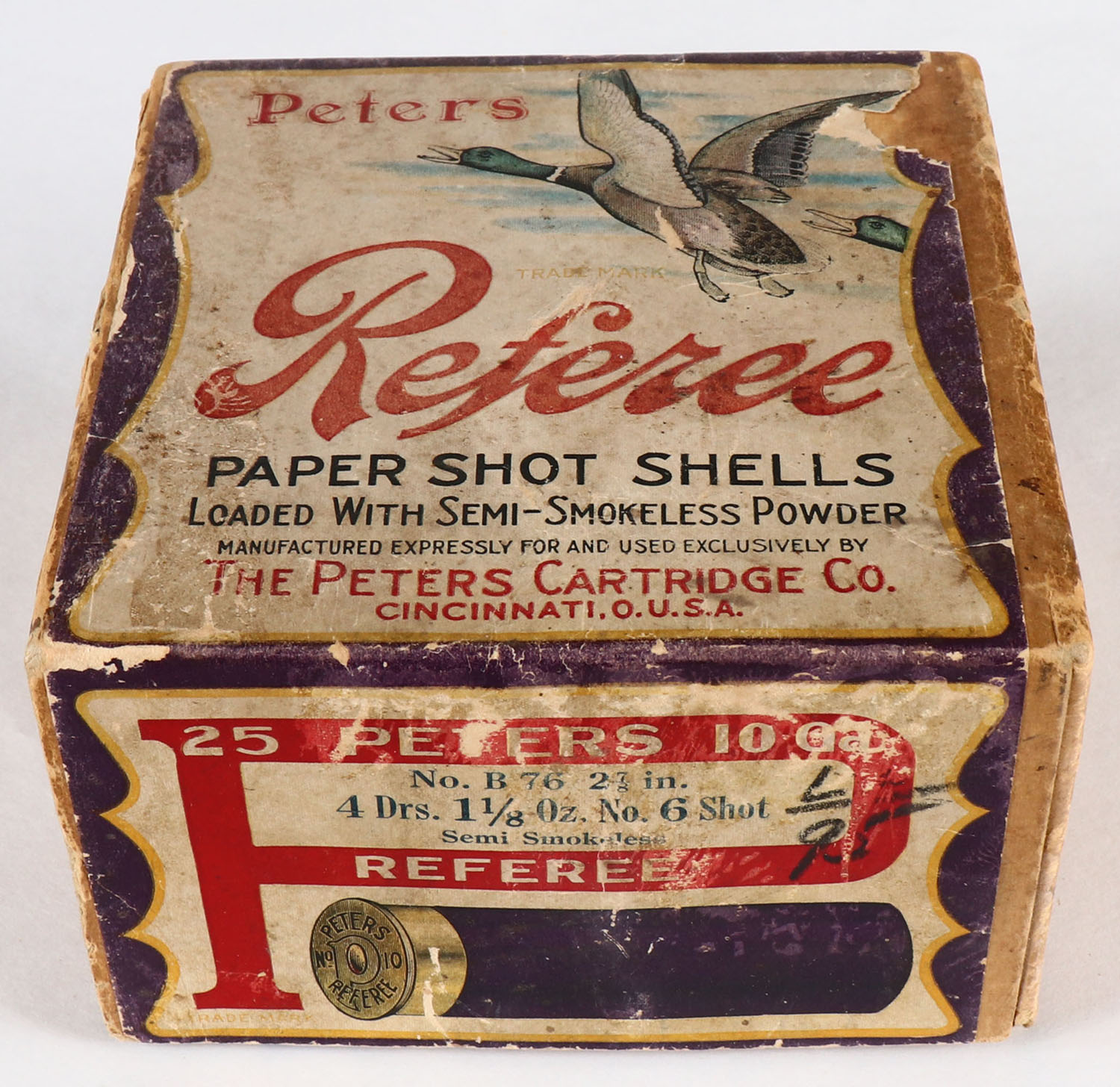 Peters Cart. Co., Referee, 10ga., 2pc., Empty, Shot size 6, Loading: No. B 76, 2 7/8'', 4 Drs., 1 1/8 Oz., No. 6 Shot, buff box with multi-colored label with flying ducks, box is solid with color to label, box has scuffing & age soiling. Grade: Very Good ++ - Value: 100 to 400