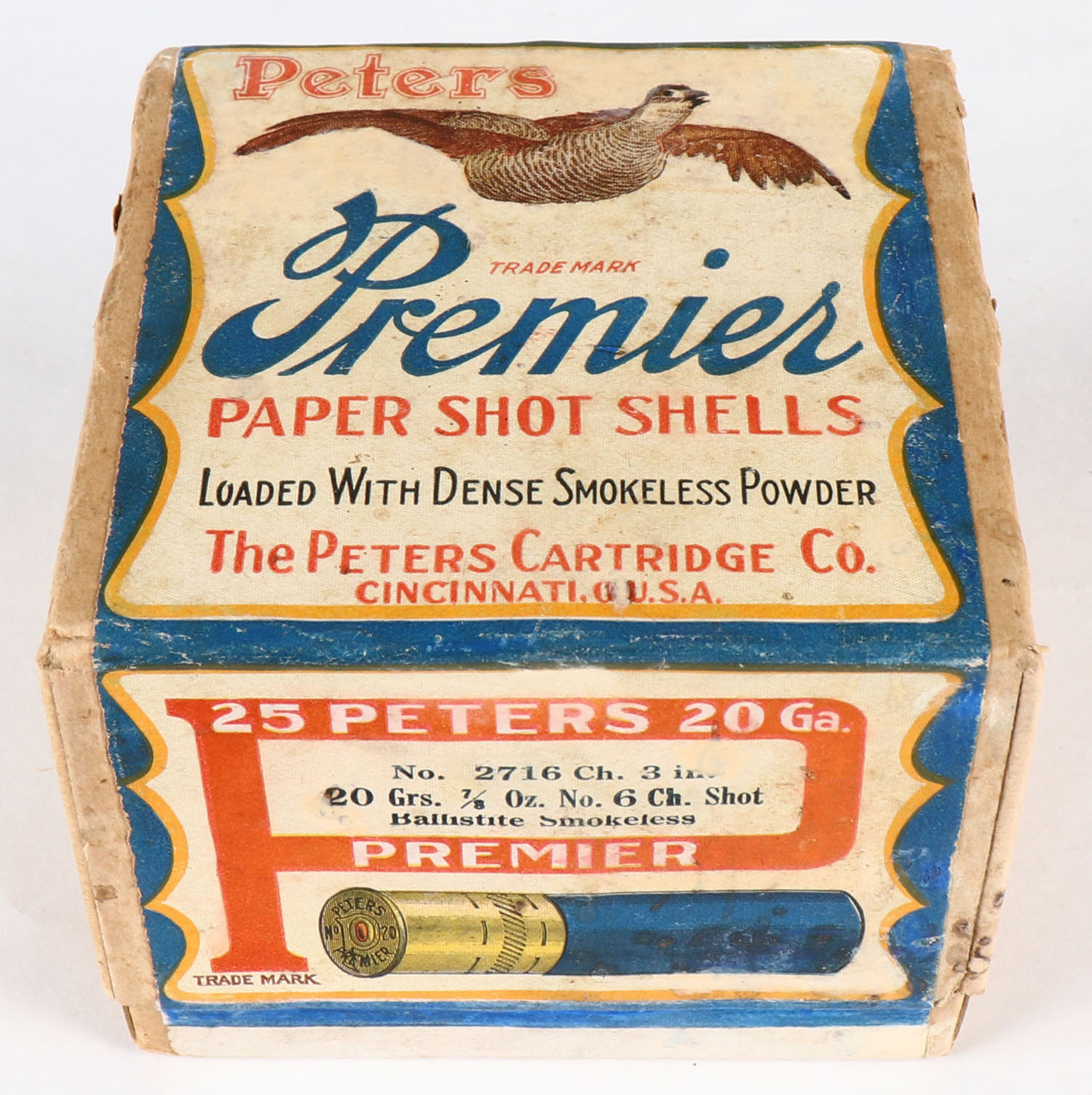 Peters Cart. Co. PREMIER, 20ga., 2pc., FULL & HALF SEALED, shot size 6 CH, buff box with multi colored label that pictures a flying Prairie Chicken, box has been lightly professionally touched up, has light age soiling. Grade: Excellent - Value: 500 to 2000
