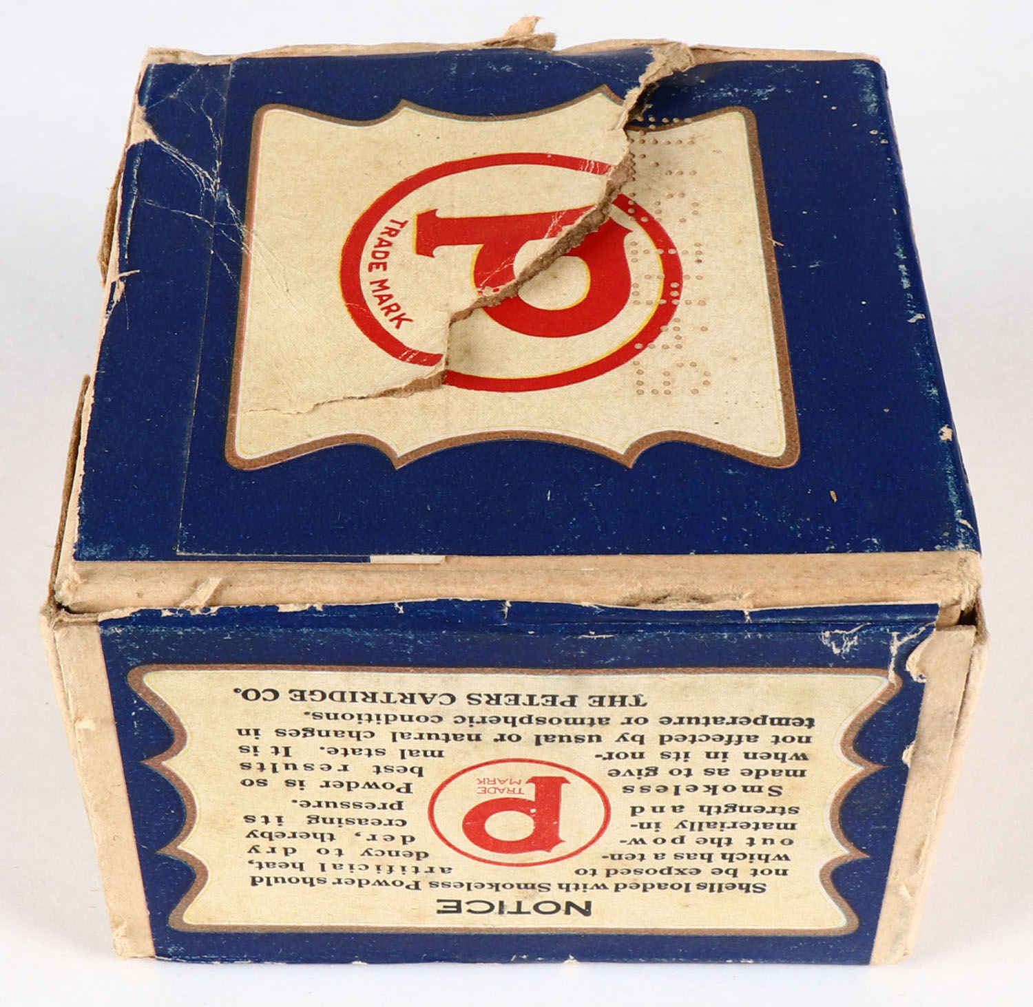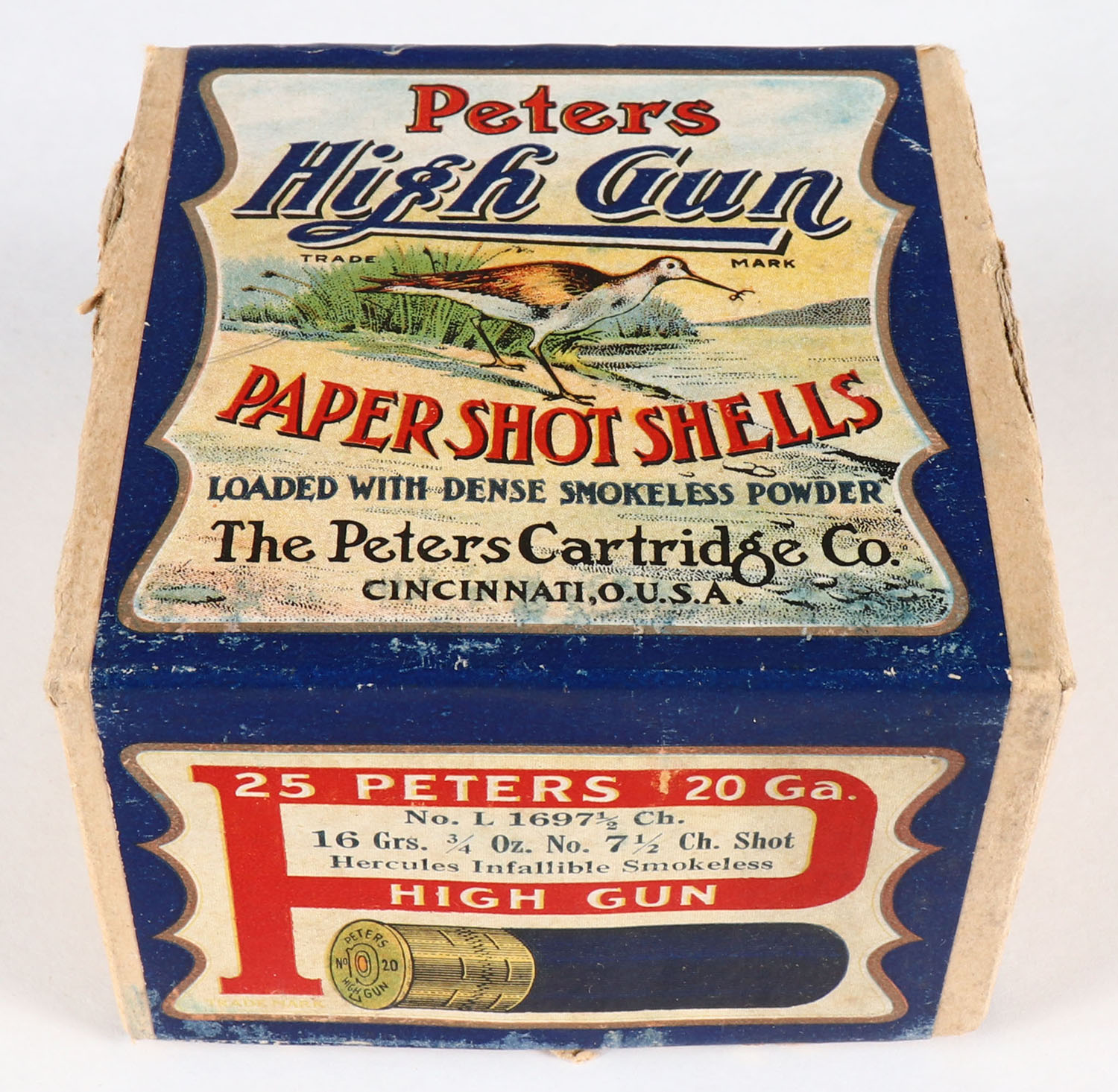 Peters Cart. Co., HIGH GUN, 20ga, 2pc., Partial 20rds., shot size 7 1/2 CH. Shot, buff box with multi colored picture of Snipe, Loading: No. L. 1697 1/2 Ch 16 Grs. 3/4 Oz. 7 1/2 CH Shot, Hercules Infallible Smokeless, box has light shell protrusion with a tear to bottom, the label is excellent! 100% original, paper shells are very good. Grade: Very Good ++ - Value: 500 to 2000