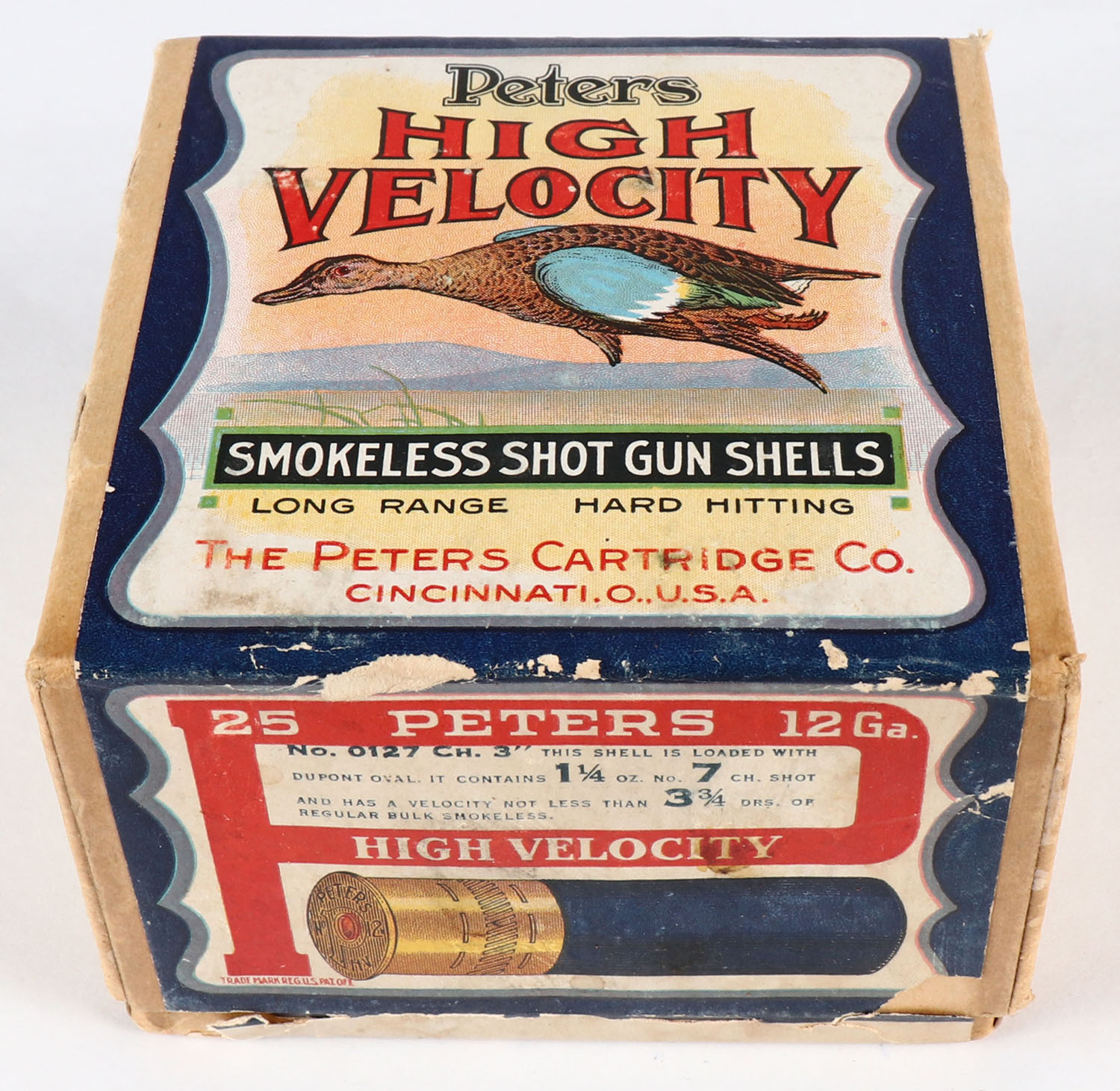 Peters Cart. Co., Blue Wing Teal, 12ga., 3'', 2pc., FULL & HALF SEALED, shot size 7 CH, buff box with multi colored label that pictures Blue Wing Teal in flight, box has very minor edge wear, box is very solid has great label with great color. Grade: Excellent - Value: 400 to 800
