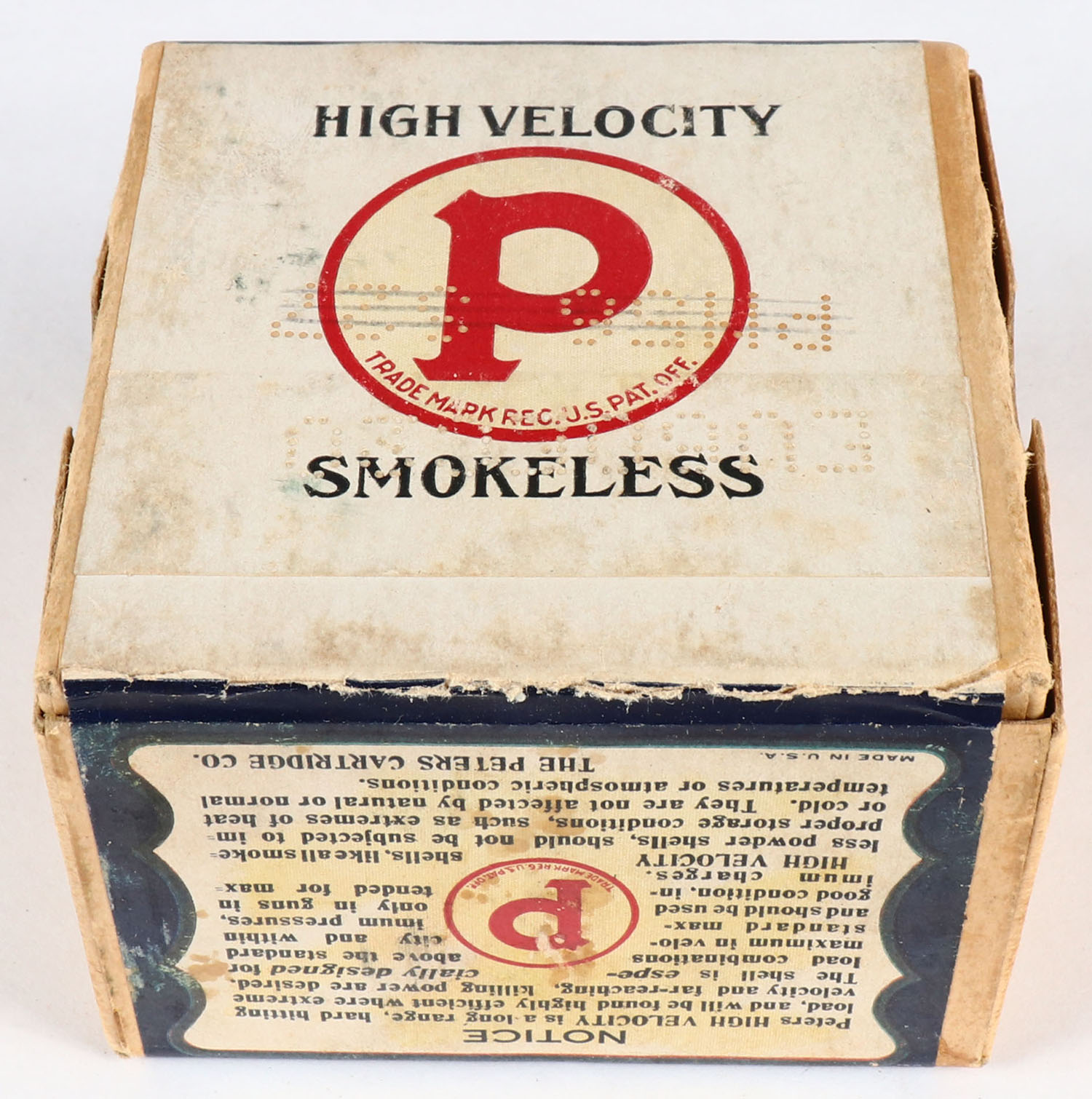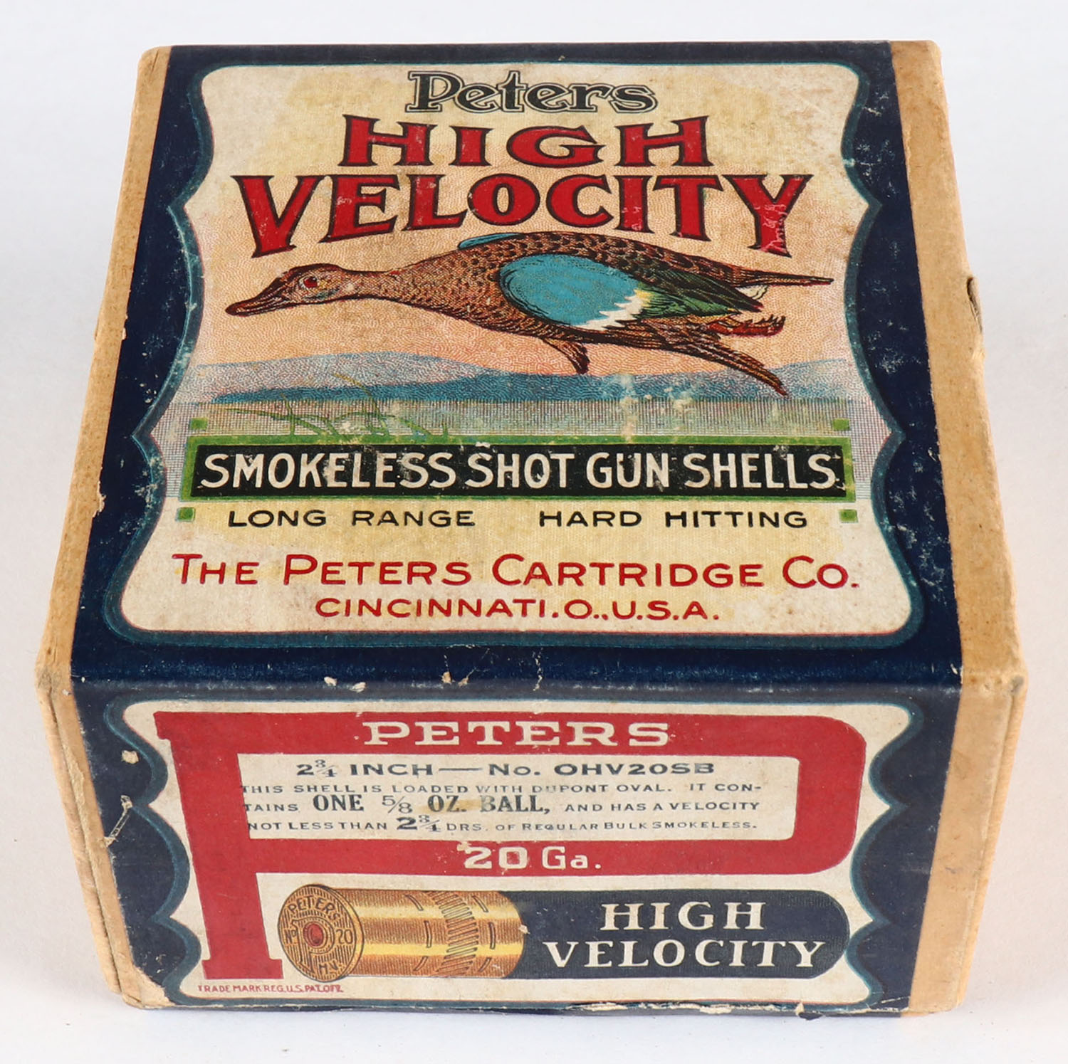 Peters Cart. Co., Blue Wing Teal, 20ga., 2 3/4'', 2pc., FULL & HALF SEALED, No. OHV20SB, 5/8 Oz. Ball, 2 3/4 Drs. buff box with multi colored label that pictures Blue Wing Teal in flight, box has minor scuffing, box is very solid has great label with great color. Grade: Excellent + - Value: 400 to 800