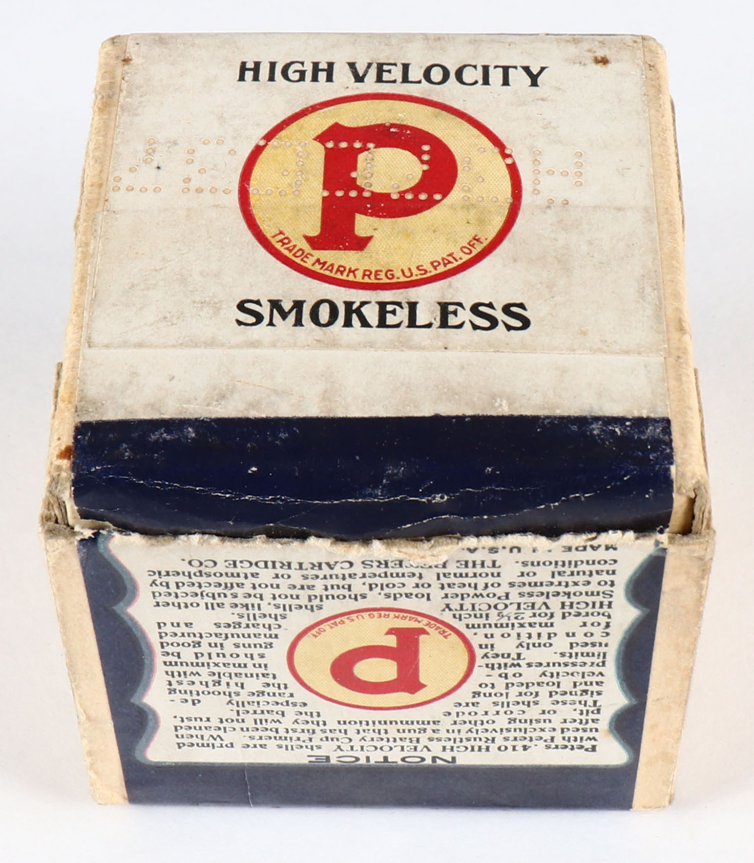 Peters Cart. Co., Blue Wing Teal, 410ga., 2 1/2'', 2pc., Empty, shot size 6CH, buff box with multi colored label that pictures Blue Wing Teal in flight, box is very solid with very good label, has light scuffing. Grade: Excellent - Value: 200 to 500