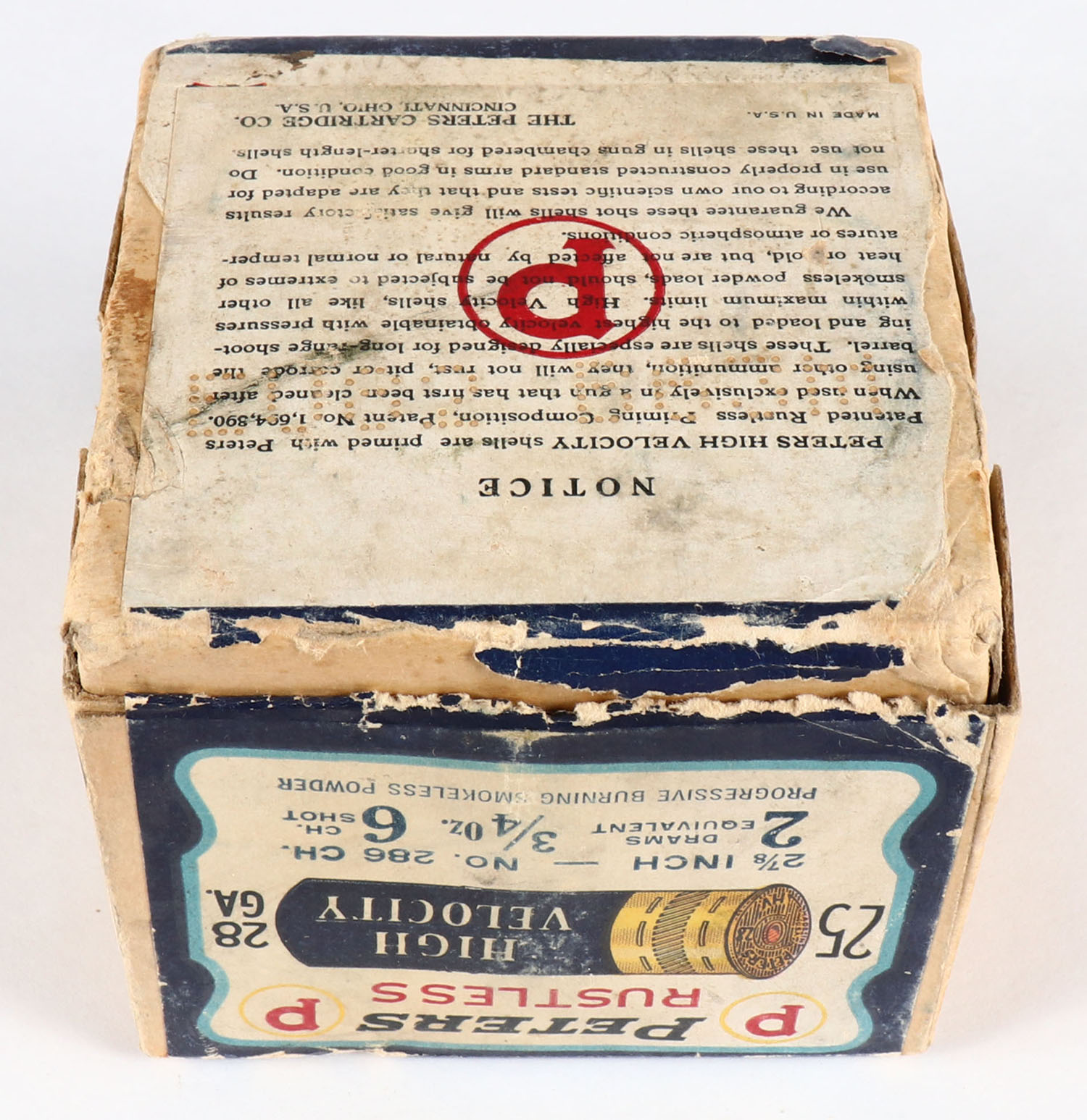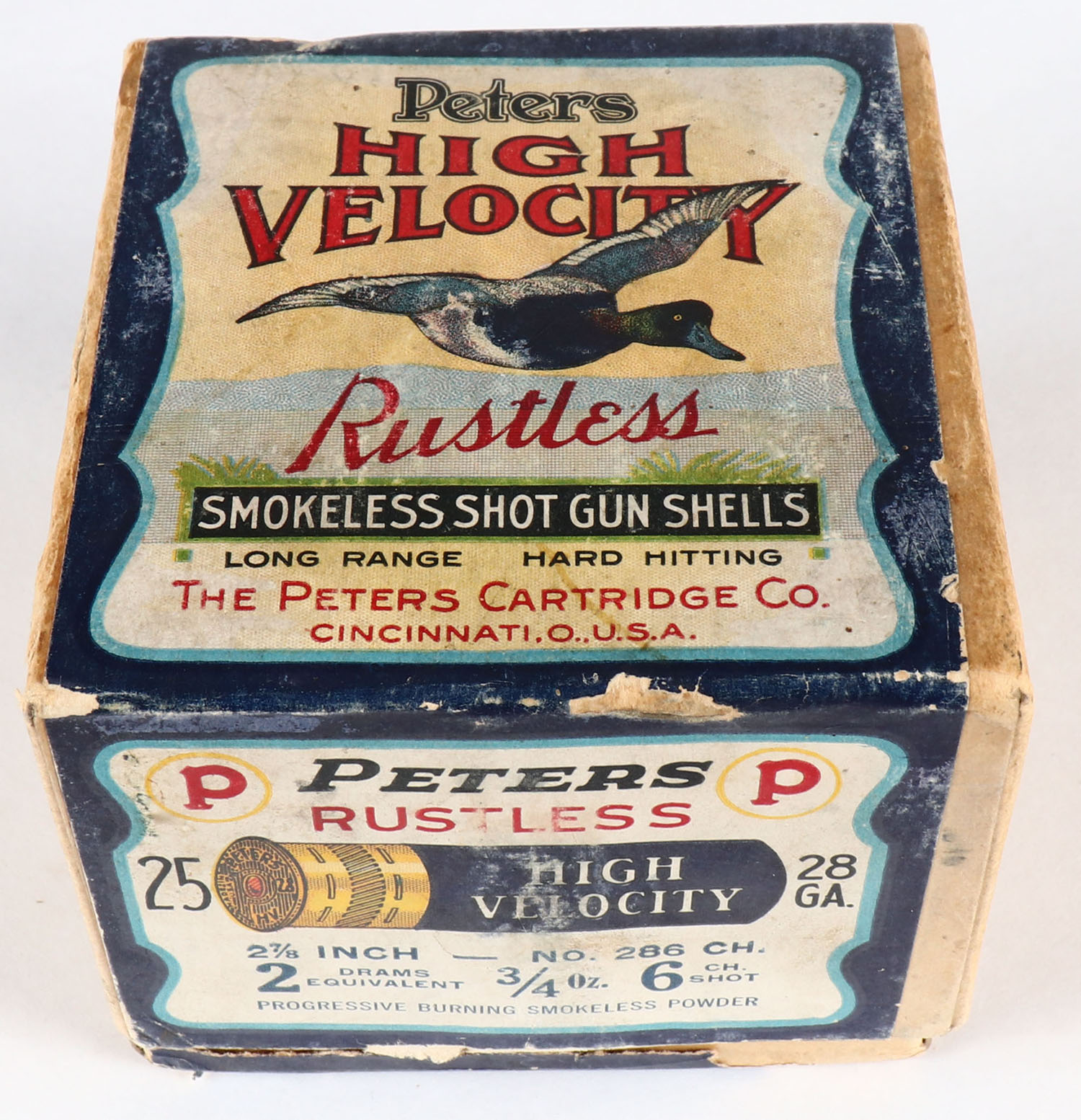 Peters Cart. Co., Blue Bill, 28ga., 2pc., FULL, shot size 6CH shot, 2 7/8'', buff box with multi colored label that pictures Blue Bill in flight, box is solid with edge wear, light age soiling, with great colors, paper shells are excellent. Grade: Very Good ++ - Value: 400 to 1500