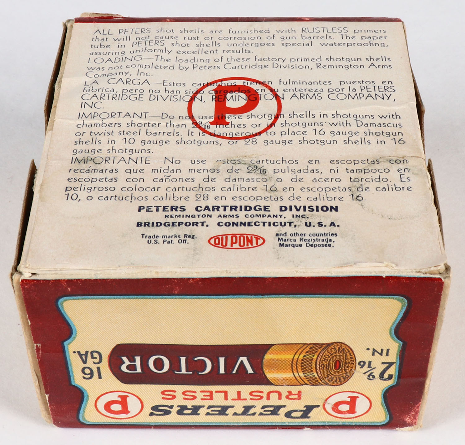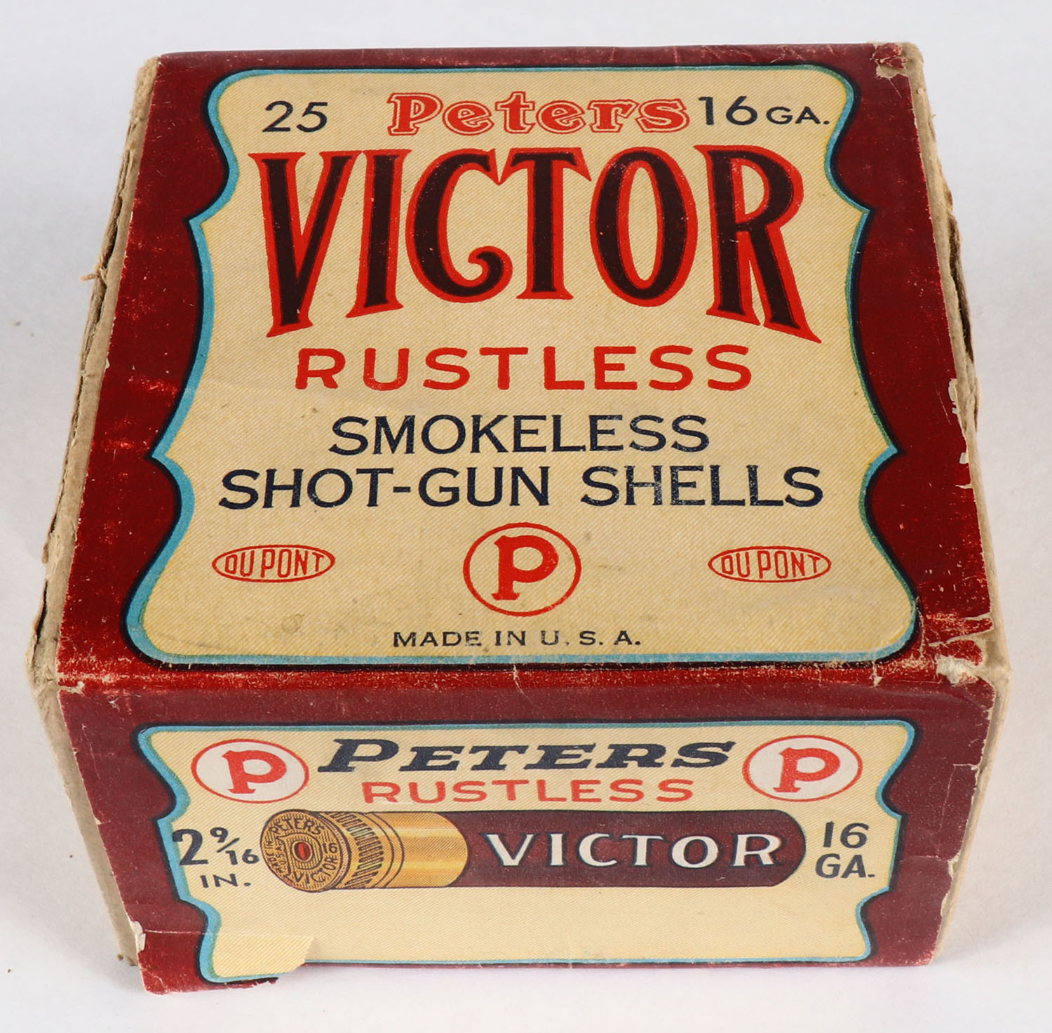 Peters Cart. Co., Victor, Rustless, 16ga., 2pc., FULL & SEALED, shot size 6CH, buff box with brown, cream & black label, box is solid with a great label, box has two seam splits. Grade: Very Good ++ - Value: 50 to 250