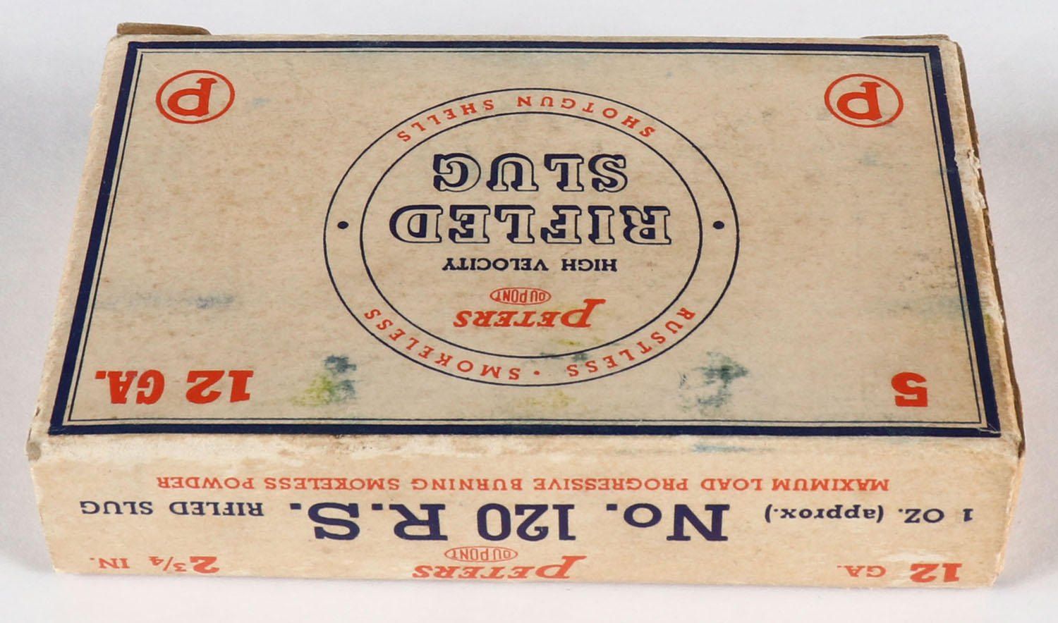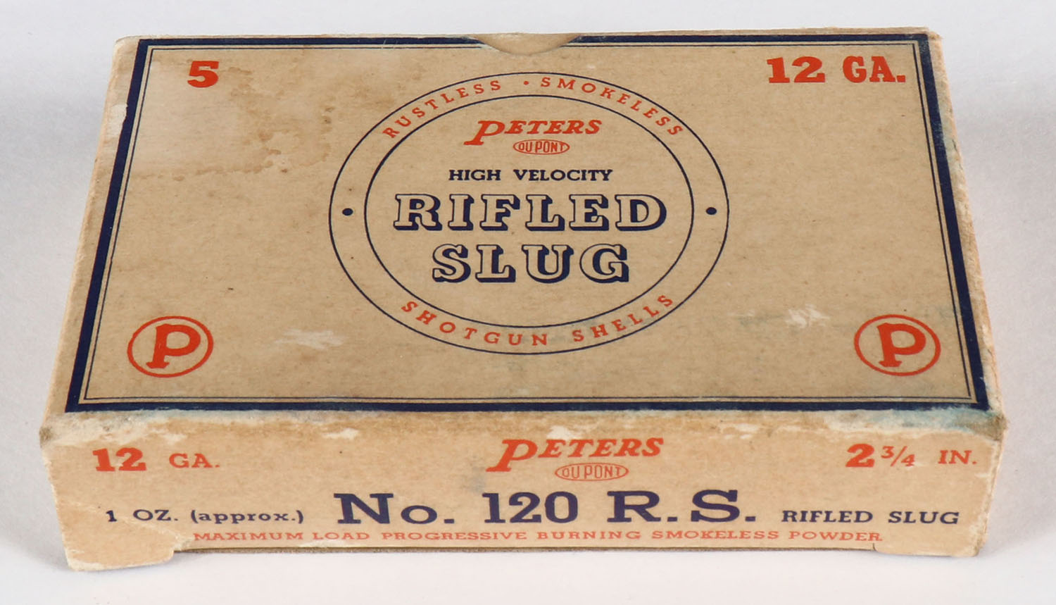 Peters Cart. Div., 12ga., 2 3/4'', 1pc., Full, shot size Rifled Slug, blue, orange & buff colored box, box is very solid with very nice colors, paper shells are excellent. Grade: Excellent - Value: 10 to 40