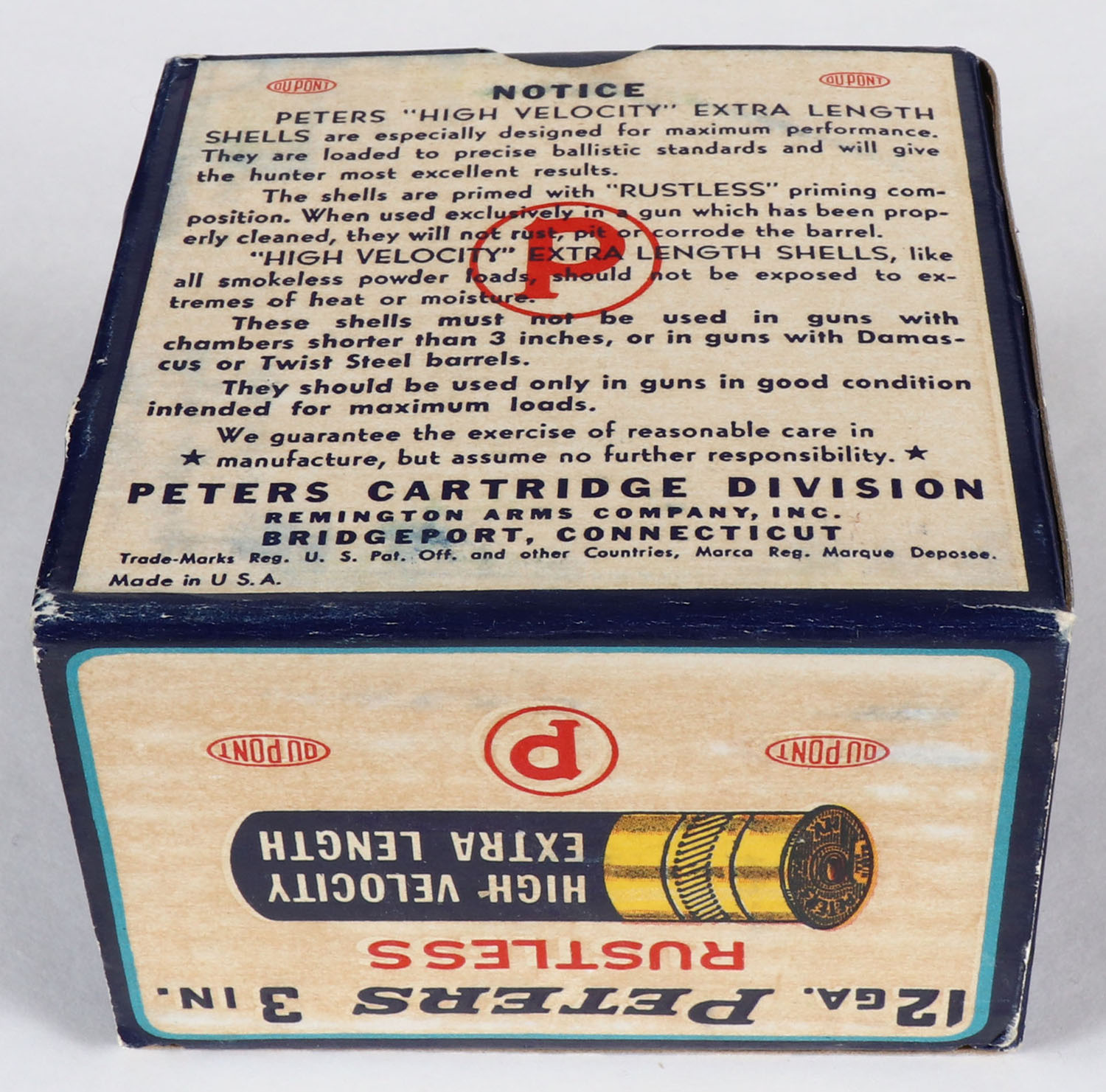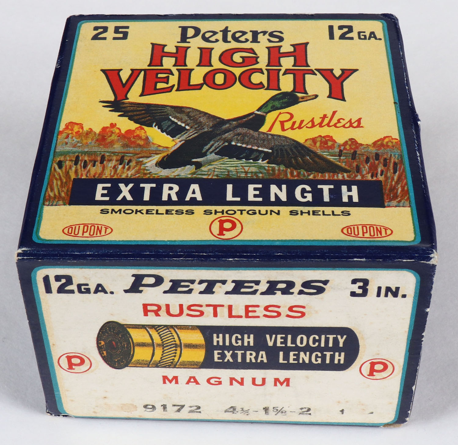 Peters Cart. Co., Bridgeport, CT, High Velocity, Extra Length 12ga., 3'' Magnum, 1pc., Full, shot size 2, multi colored box that pictures mallard flying out of the marsh grass, box is very solid with excellent colors, paper shells are excellent. Grade: Excellent ++ - Value: 100 to 200