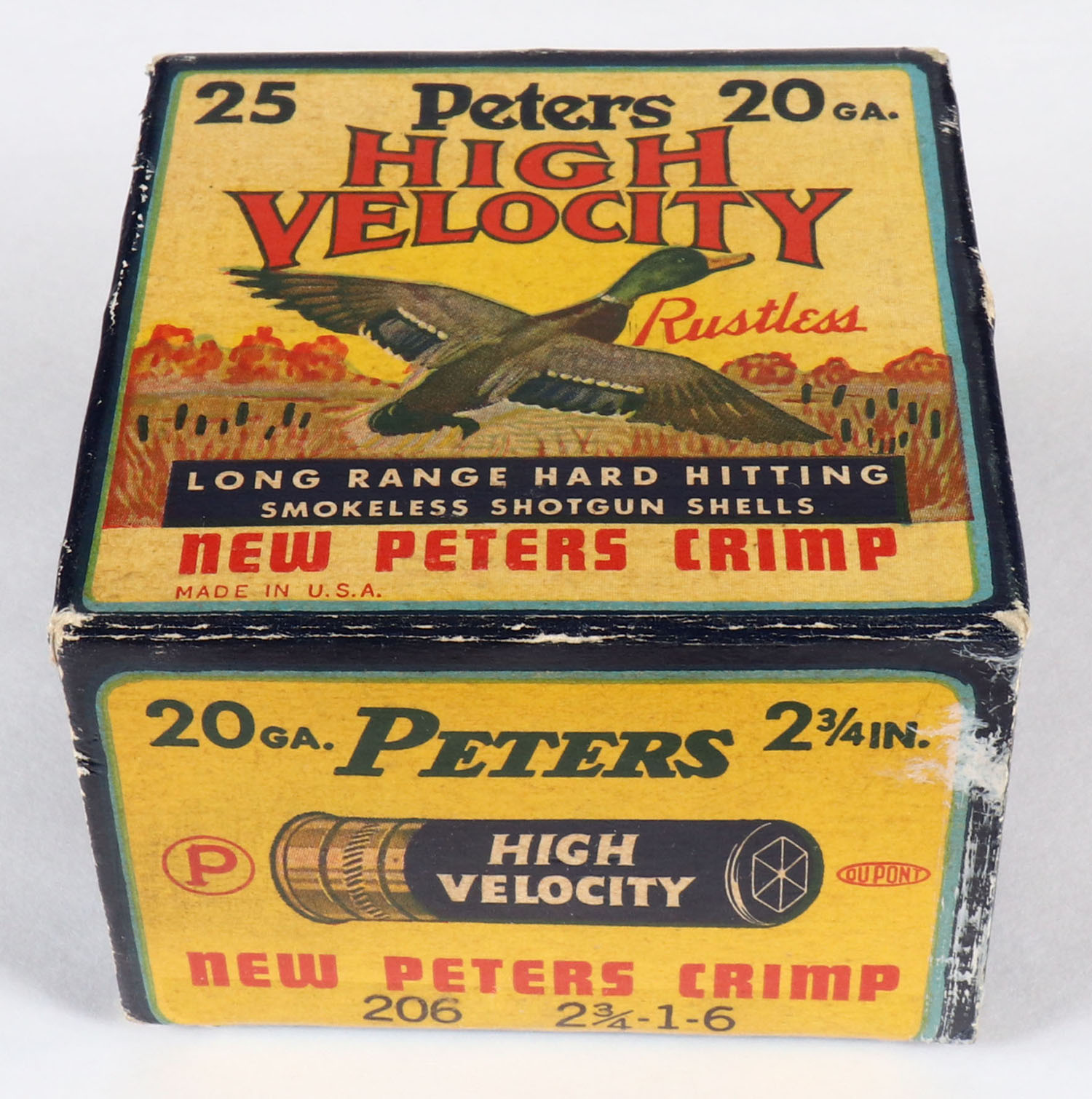 Peters Cart. Co., High Velocity, New Peters Crimp, 20ga., 1pc., Full, shot size 6, multi colored box that pictures mallard flying out of the marsh grass, box is solid with edge wear, paper shells are excellent. Grade: Excellent - Value: 20 to 100