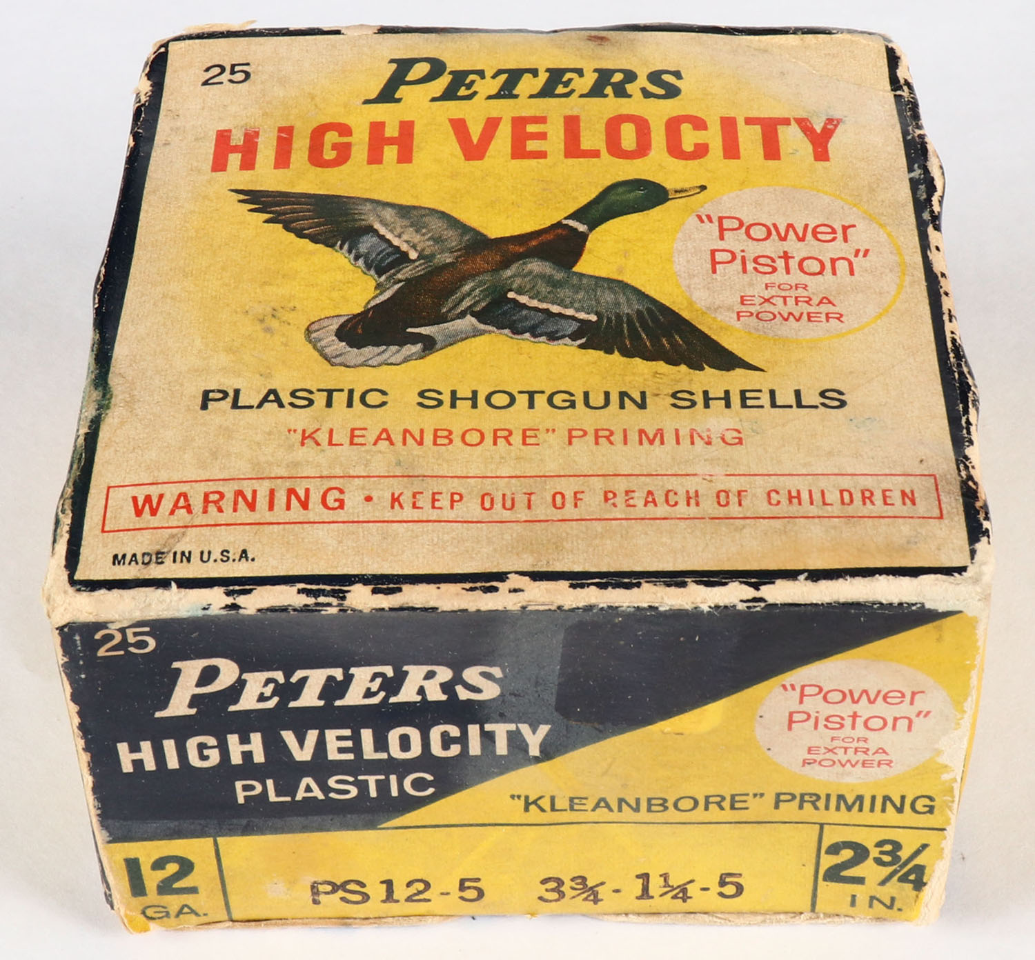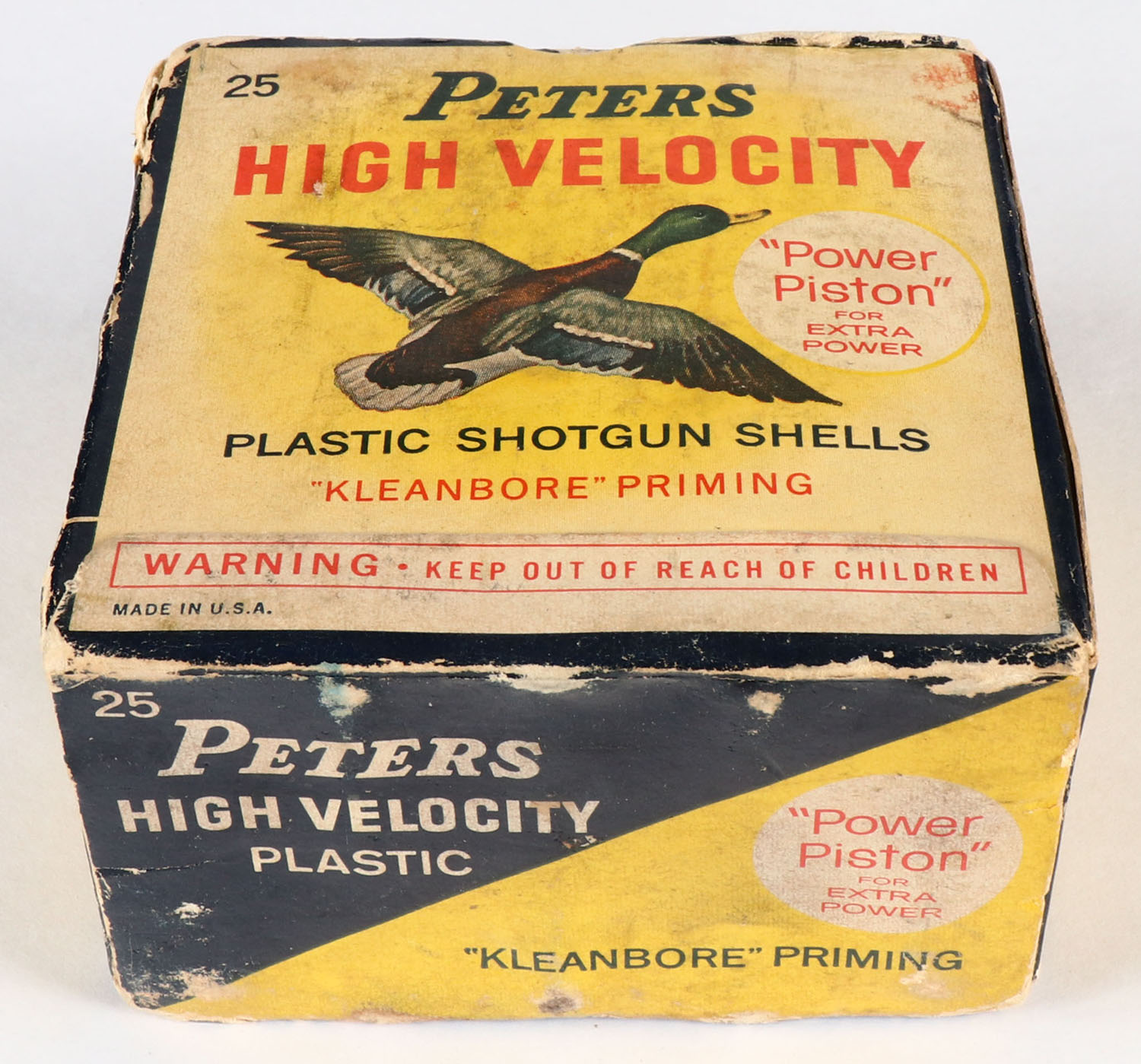 Peters Cart. Co., High Velocity, 12ga, 2 3/4'', 1pc., Full, shot size 5, multi colored box that pictures mallard flying, box has age soiling & edge wear, plastic shells are good. Grade: Good ++ - Value: 10 to 30