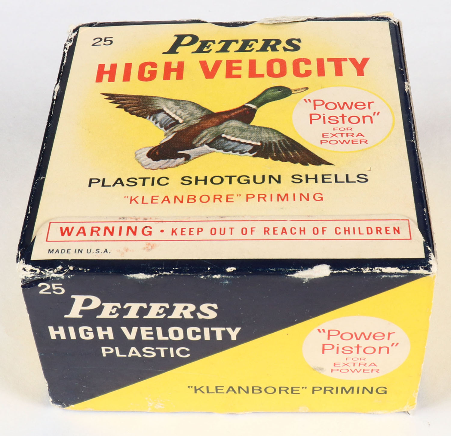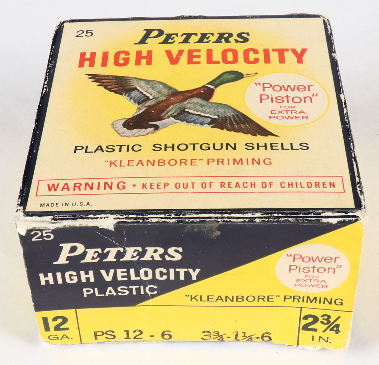 Peters Cart. Co., High Velocity, 12ga, 2 3/4'', 1pc., Full, shot size 6, multi colored box that pictures mallard flying, box has edge wear with nice colors, plastic shells are excellent. Grade: Very Good ++ - Value: 10 to 30