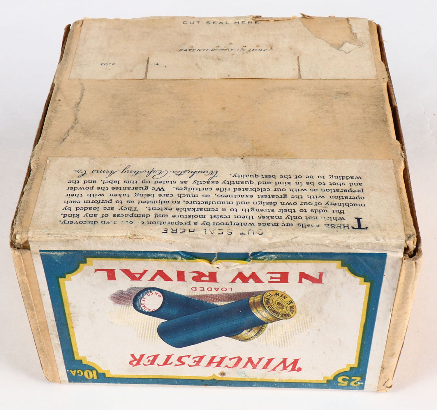 Winchester, NEW RIVAL, 10 GAUGE, 2pc., FULL & HALF SEALED, Shot Size 8, buff box with multi-colored label that pictures the two crossed shells, loaded BLACK POWDER shells, Box is solid with paint on one side of box, has very nice colors to label. Grade: Very Good ++ - Value: 200 to 800