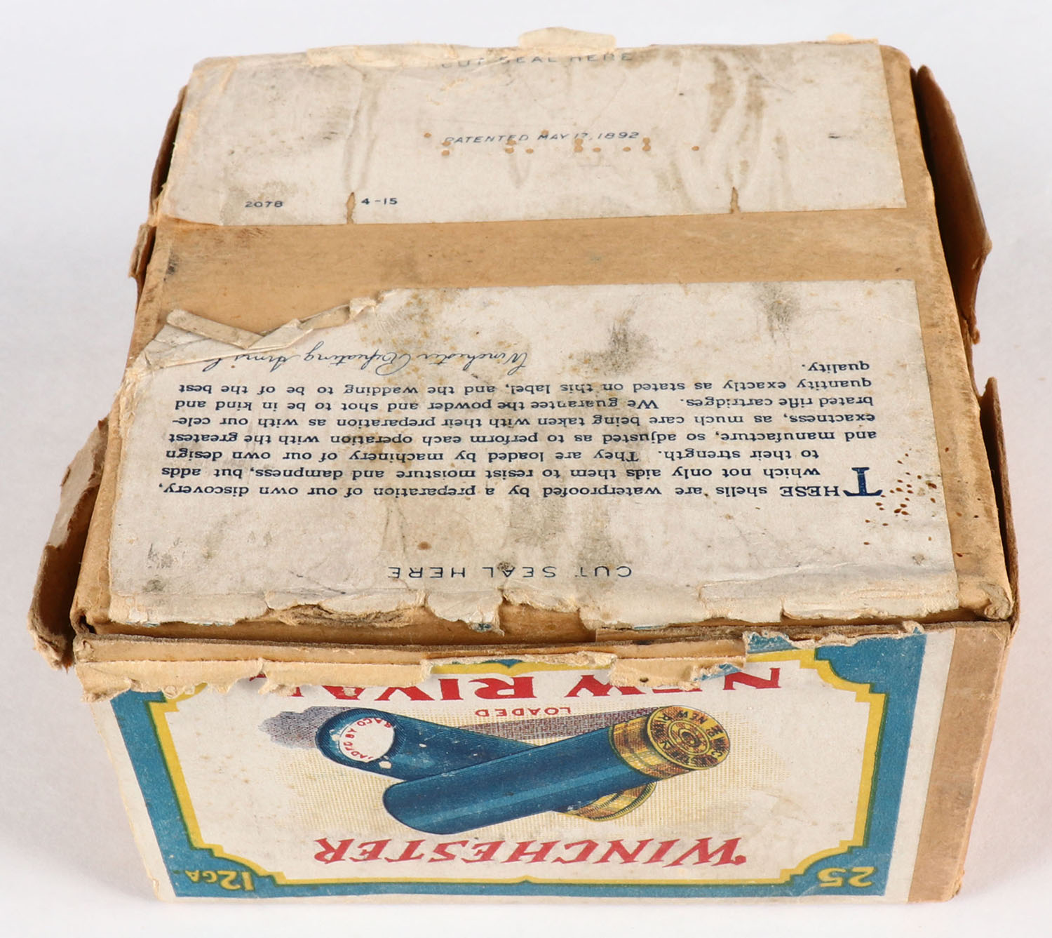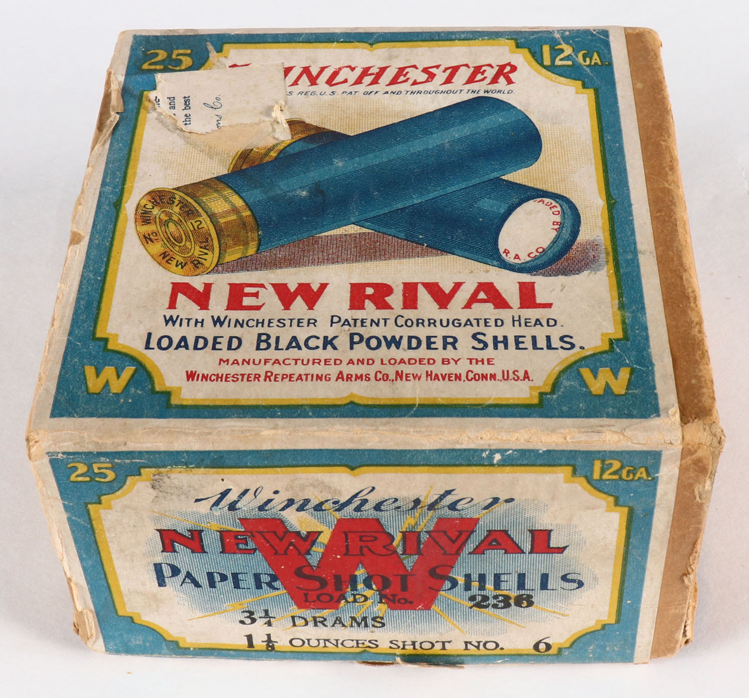 Winchester, NEW RIVAL, 12ga., 2pc., Empty, Shot Size 6, buff box with multi-colored label that pictures the two crossed shells, loaded BLACK POWDER shells, box has light age soiling & scuffing with edge wear. Grade: Very Good + - Value: 40 to 250