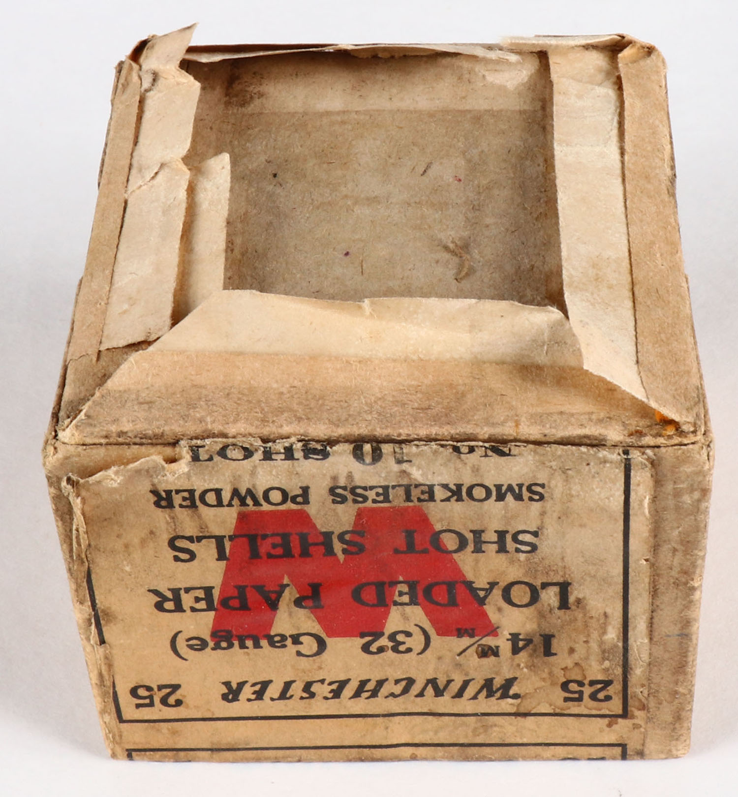 RARE Winchester, 32 GAUGE! 14m/m (32 Gauge), 2pc., FULL, PAPER SHOT SHELLS, shot size 10, buff box with buff, red & black label, box is solid with nice colors, box has scuffing & light soiling, VERY RARE & HARD TO FIND IN 32 GAUGE. Grade: Very Good ++ - Value: 150 to 800