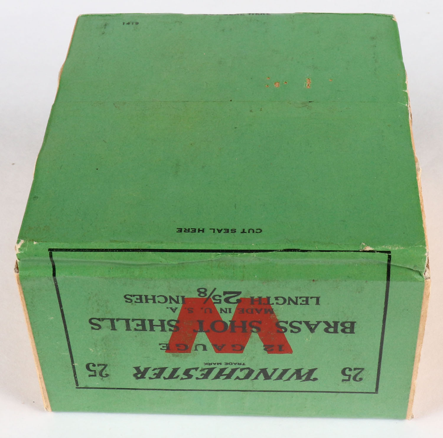 Winchester, BRASS SHOT SHELLS, 12ga., 2pc., FULL & SEALED, Length 2 5/8'', buff box with green, red & black label, box is very solid & has Minty colors to label. Grade: MINT - Value: 200 to 800