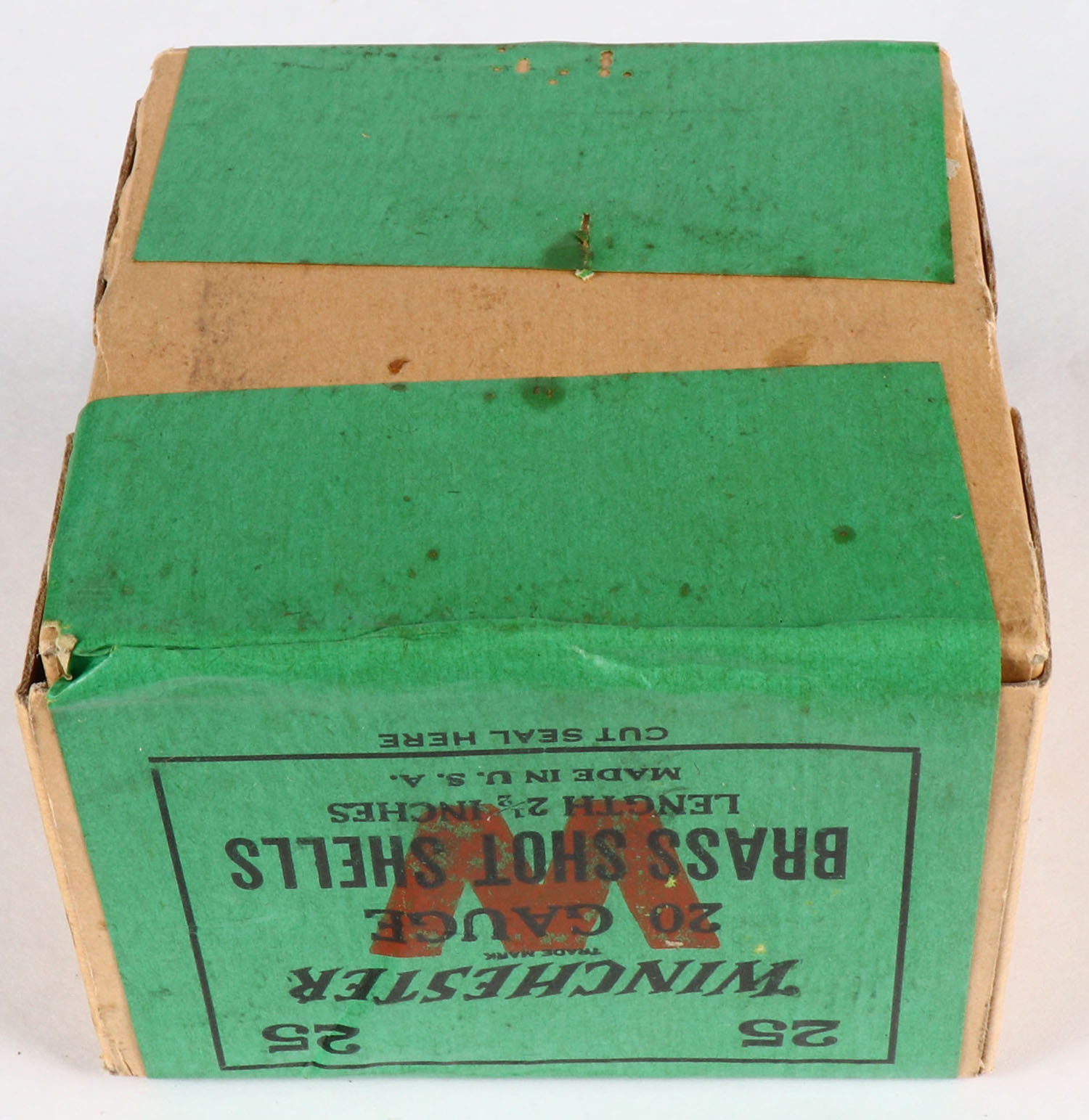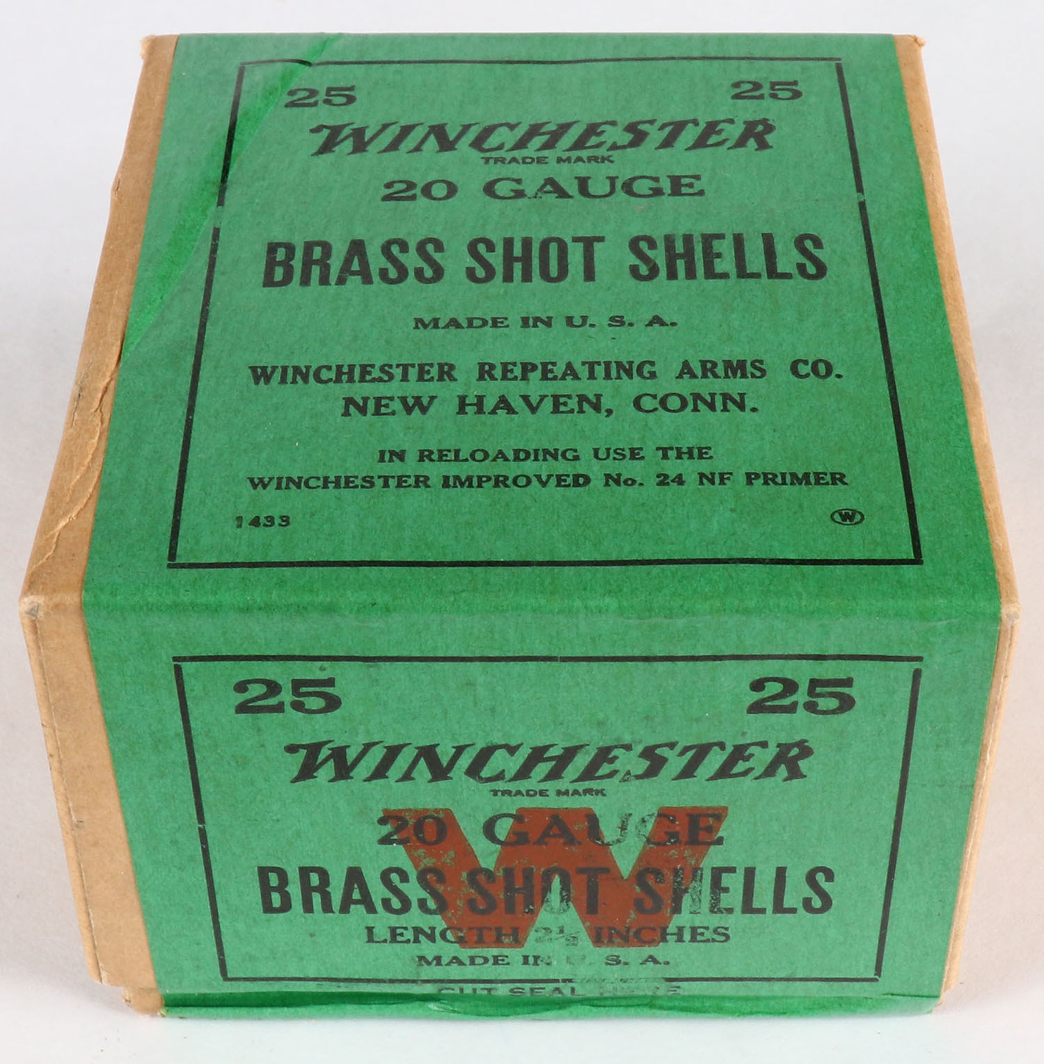 Winchester, BRASS SHOT SHELLS, 20ga., 2pc., FULL & SEALED, Length 2 1/2'', buff box with green, red & black label, box is very solid & has Minty colors to label. Grade: Excellent ++ - Value: 200 to 800