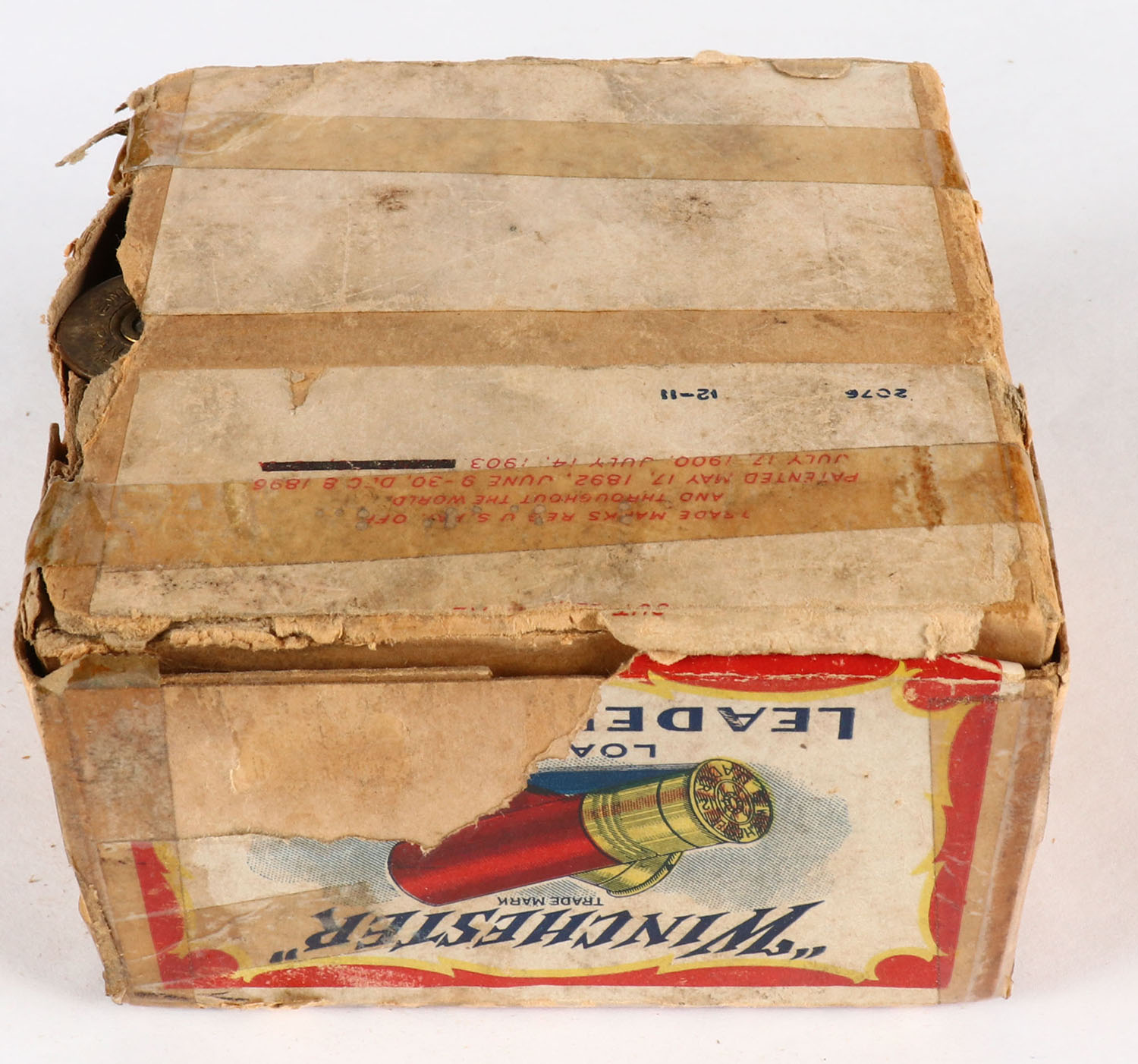 Winchester, LEADER, 12ga, 2pc., Full of incorrect shot sizes, shot size 7 1/2CH, Buff box with red, yellow, white & black label showing lightning bolt, box has seam splits with tape repairs, box has soiling & scuffing, shells are good. Grade: Good - Value: 30 to 90