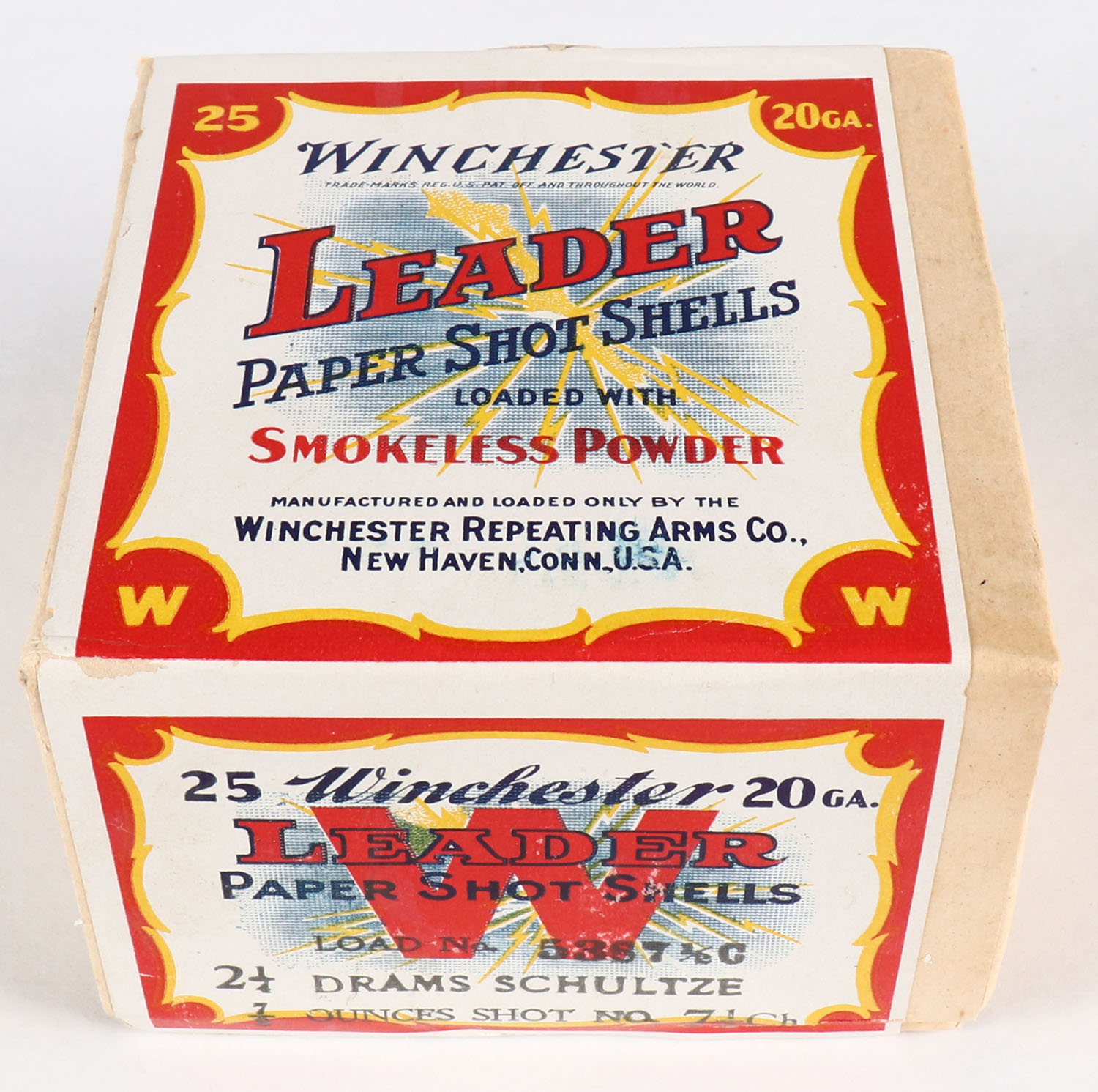 Winchester, LEADER, 20ga, 2pc., FULL & SEALED, shot size 7 1/2CH, Buff box with red, yellow, white & black label showing lightning bolt, box is very solid with great color to label. Grade: Excellent ++ - Value: 200 to 800