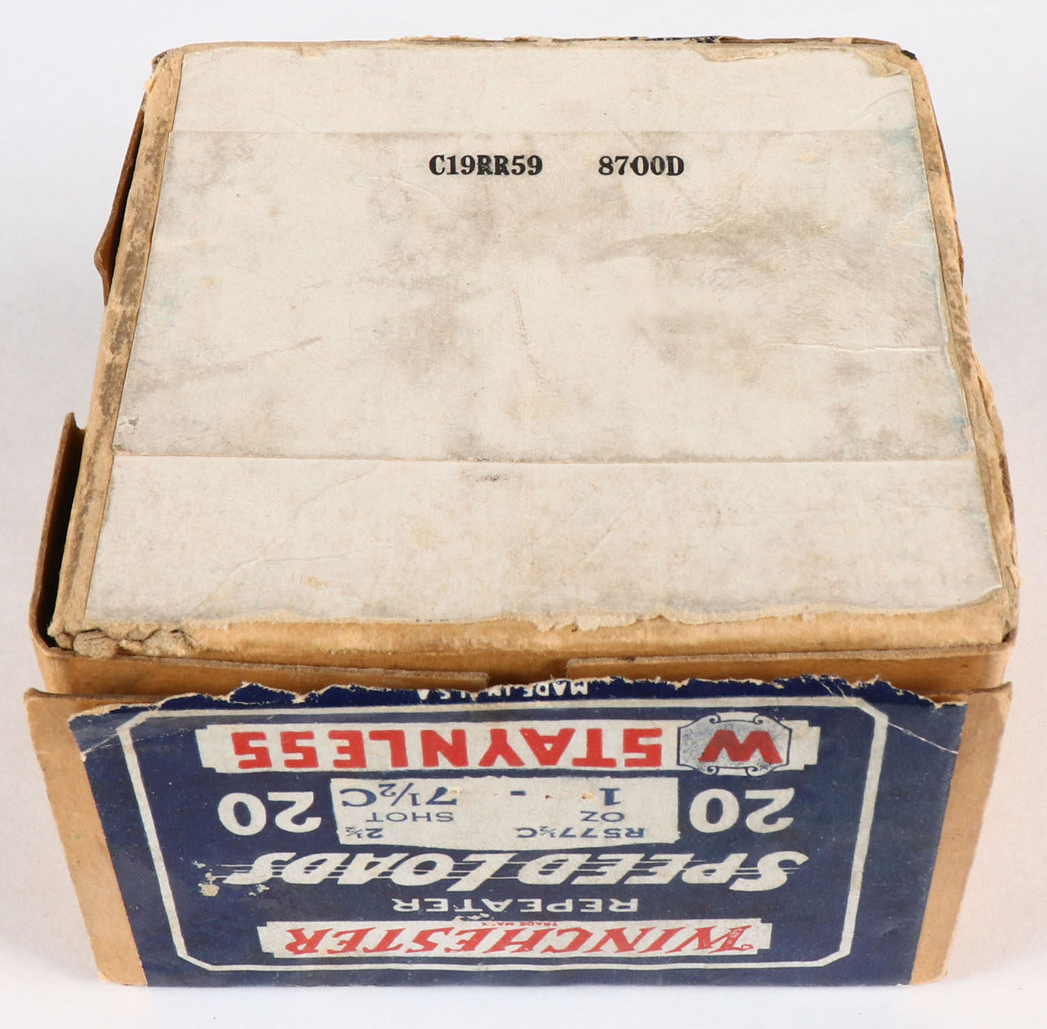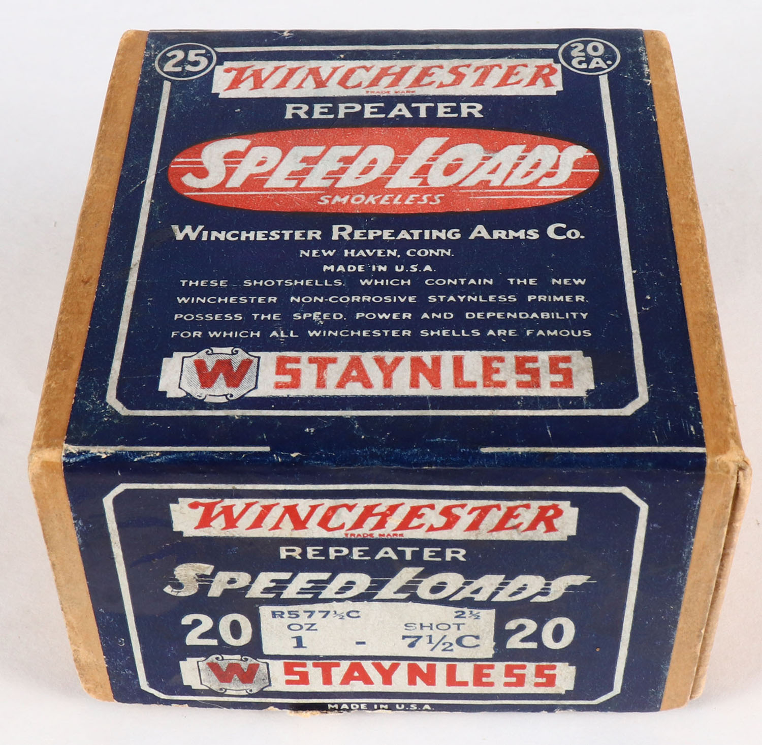 Winchester, Repeater Speed Loads, STAYNLESS, 20ga., 2pc., Empty, shot size 7 1/2 C, buff box with blue, red & white label, box is solid with excellent colors. Grade: Very Good ++ - Value: 20 to 80