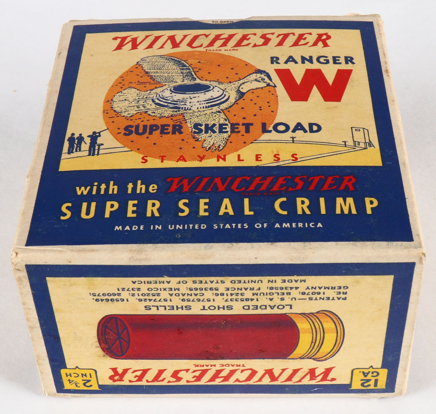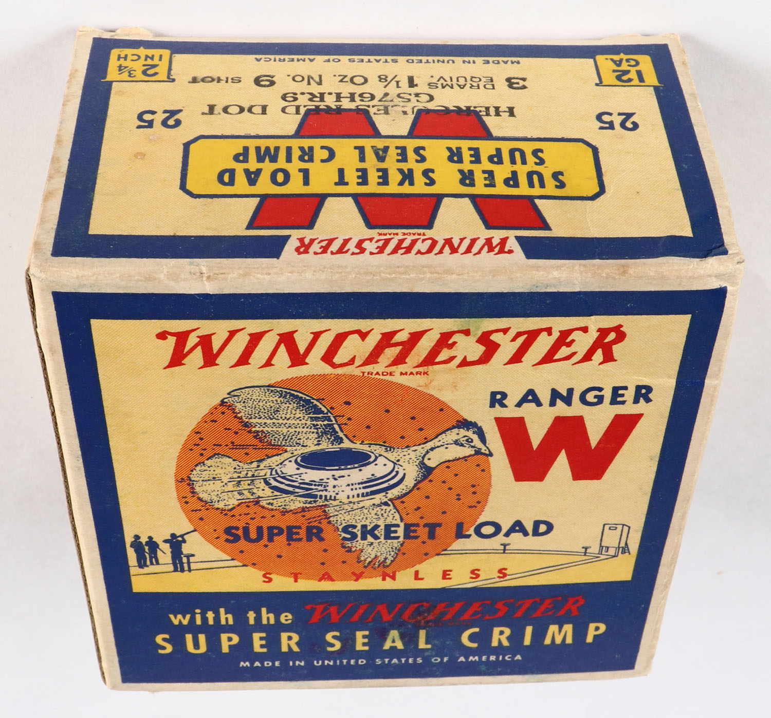 Winchester, Ranger Super Skeet Load, Hercules Red Dot, 12ga, 1pc., 2 3/4'', Full, White, blue & red box that pictures flying Quail with skeet in body & shot all around, Loading: 3 Drams, 1 1/8 Oz., No. 9 Shot, Box is very solid with great colors, Shells are excellent. Grade: Excellent ++ - Value: 50 to 300