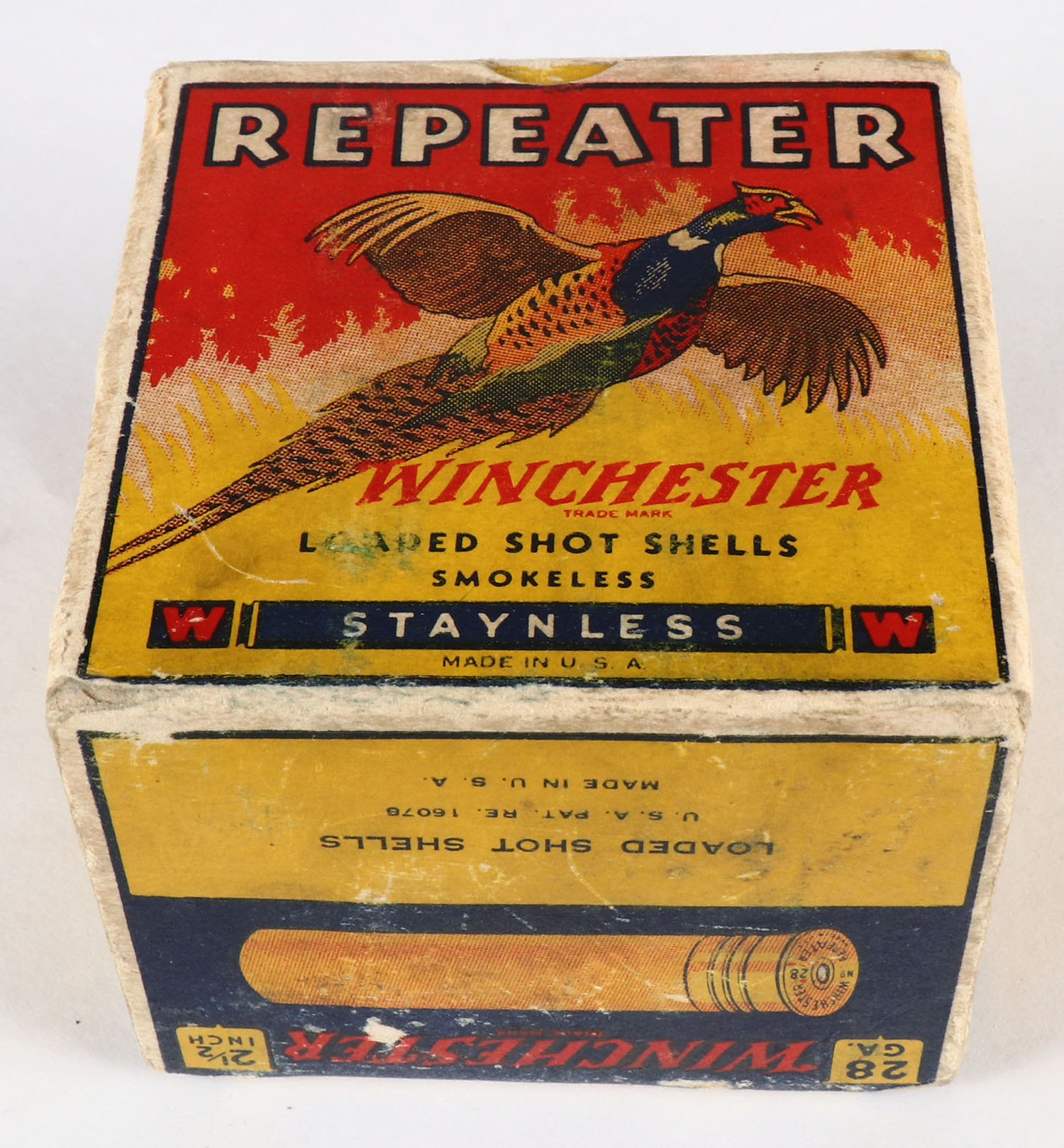 VERY RARE Winchester, PHEASANT BOX, REPEATER, 28ga., 1pc., FULL, Multi-colored PHEASANT BOX!!! Loading: 1 3/4 Drams, 5/8 Oz., 7 Shot, 2 1/2'', box is very solid with light scuffing & light edge wear, box has very nice colors, shells are excellent, HARD TO FIND BOX! Grade: Very Good ++ - Value: 2000 to 6000