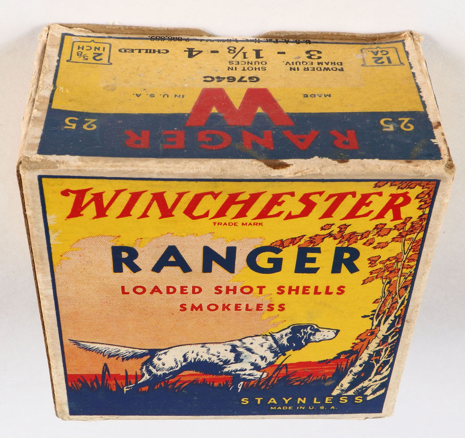 Winchester, Ranger, 12ga, 1pc., Partial 23rds, Shot Size 4 Chilled, multi colored box, dog on point, 2 5/8'', box has age soiling & scuffing with very nice colors, shells are very good. Grade: Very Good ++ - Value: 20 to 100